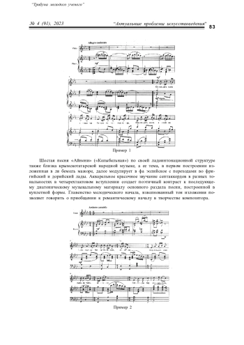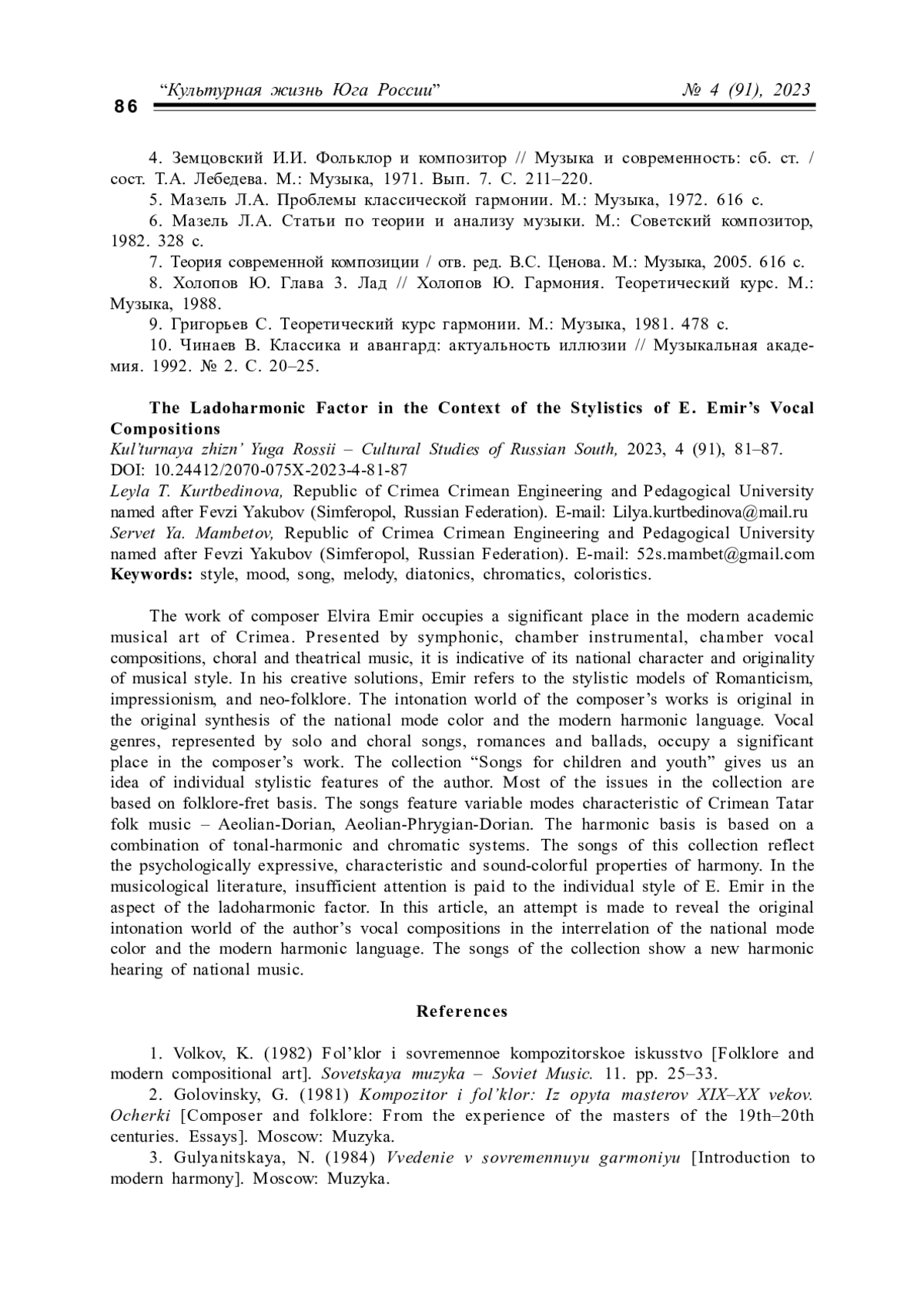 В музыковедческой литературе недостаточное внимание уделено индивидуальному стилю Э. Эмир в аспекте ладогармонического фактора. В настоящей статье предпринята попытка раскрыть самобытный интонационный мир вокальных сочинений автора во взаимосвязи национального ладового колорита и современного гармонического языка