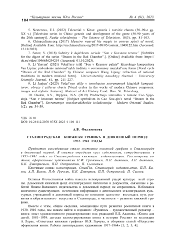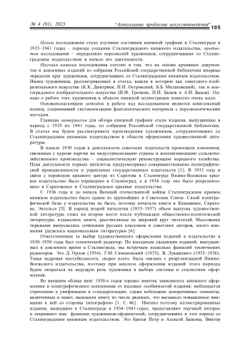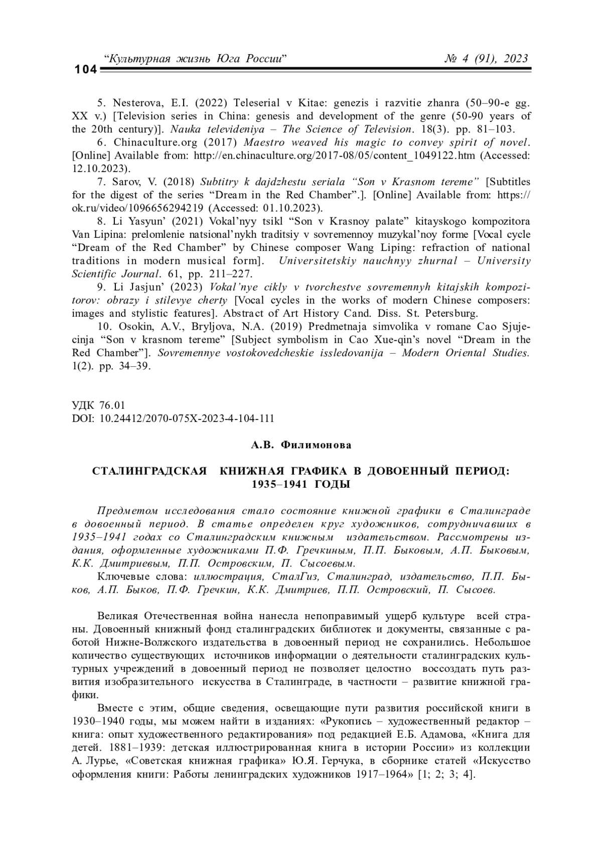 Предметом исследования стало состояние книжной графики в Сталинграде в довоенный период. В статье определен круг художников, сотрудничавших в 1935–1941 годах со Сталинградским книжным издательством. Рассмотрены издания, оформленные художниками П. Ф. Гречкиным, П. П. Быковым, А. П. Быковым, К. К. Дмитриевым, П. П. Островским, П. Сысоевым.