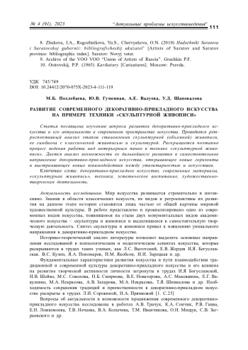 Статья посвящена изучению вопроса развития декоративно-прикладного искусства и его актуальности в современном пространстве искусства. Проводится ретроспективный анализ этапов становления скульптурной (объемной) живописи, ее симбиоза с классической живописью и скульптурой. Раскрывается поэтапно процесс ведения работы над интерьерным панно в технике «скульптурной живописи». Дается анализ возможности ее дальнейшего развития в самостоятельное направление декоративно-прикладного искусства, открывающее новые горизонты и выстраивающее новые взаимодействия между утилитарностью и искусством