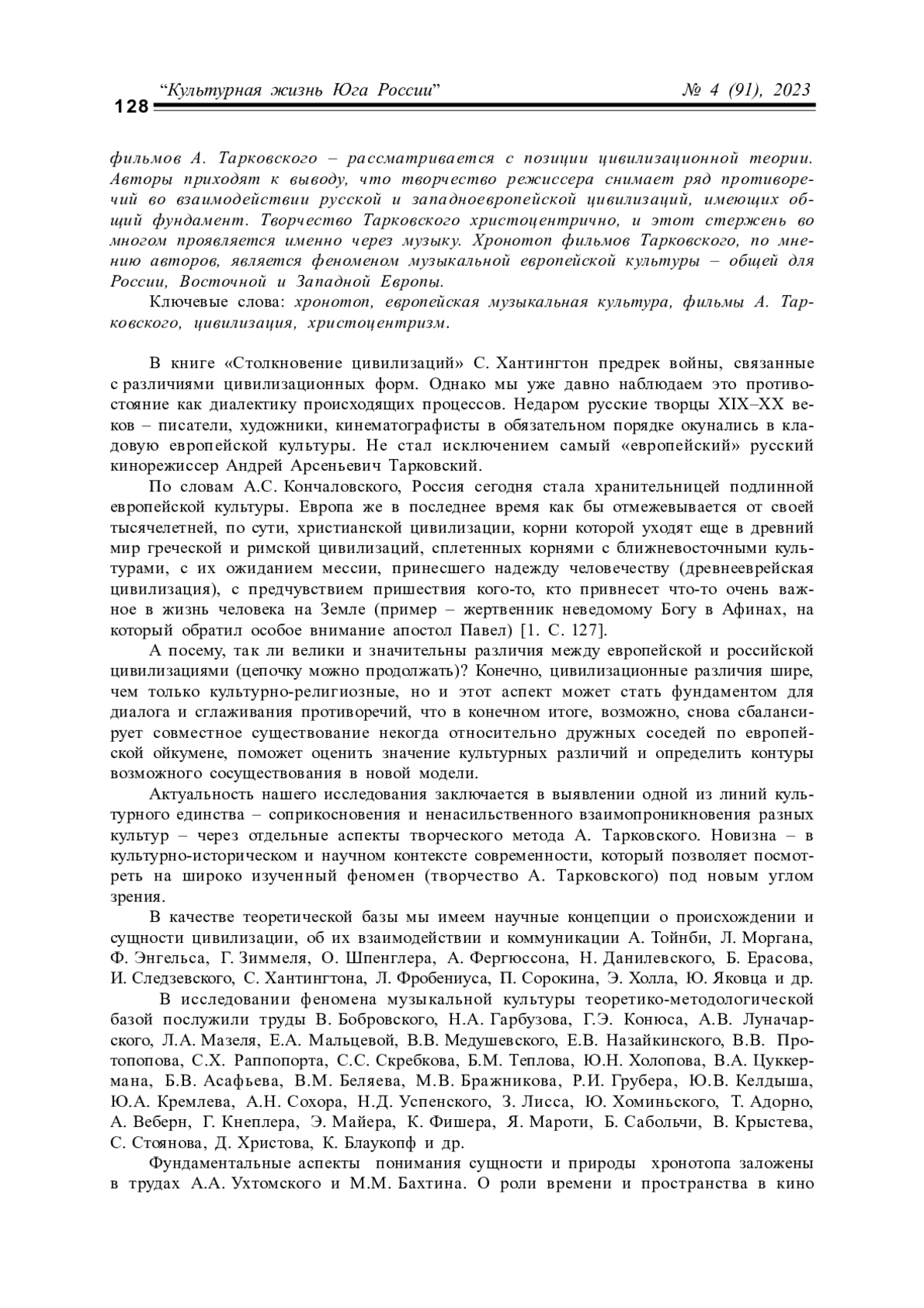 В статье приводятся аргументы в пользу того, что фильмы кинорежиссера Андрея Арсеньевича Тарковского – это запечатленная в звукозрительных образах музыка. Предмет исследования – средства создания музыкального хронотопа фильмов А. Тарковского – рассматривается с позиции цивилизационной теории. Авторы приходят к выводу, что творчество режиссера снимает ряд противоречий во взаимодействии русской и западноевропейской цивилизаций, имеющих общий фундамент. Творчество Тарковского христоцентрично, и этот стержень во многом проявляется именно через музыку. Хронотоп фильмов Тарковского, по мнению авторов, является феноменом музыкальной европейской культуры – общей для России, Восточной и Западной Европы.
