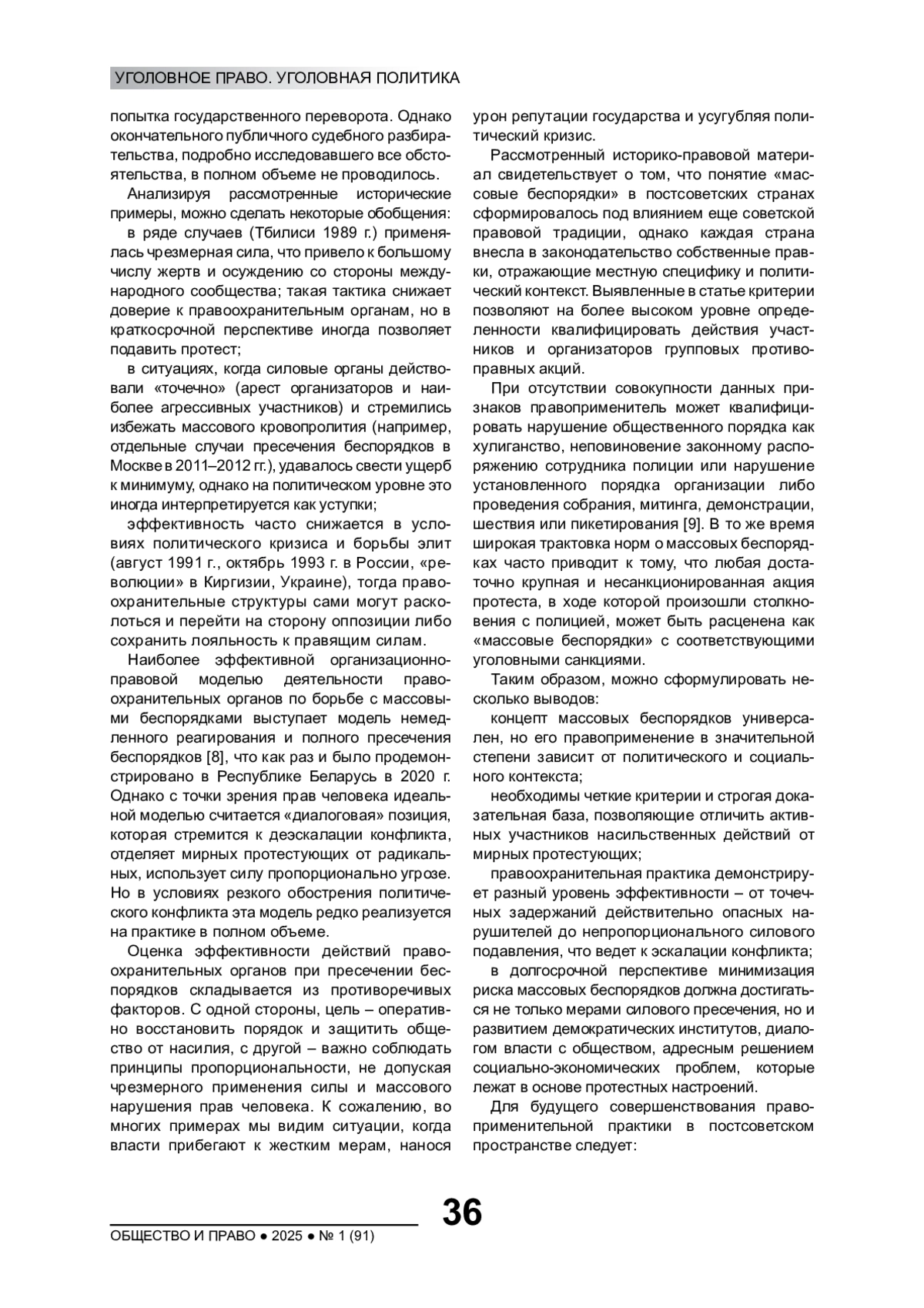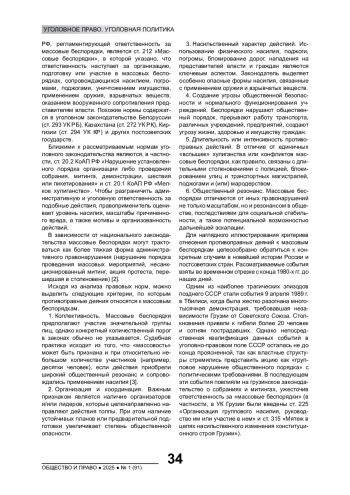 Статья: КРИТЕРИИ ОТНЕСЕНИЯ ПРОТИВОПРАВНЫХ ДЕЯНИЙ К МАССОВЫМ БЕСПОРЯДКАМ (2025)