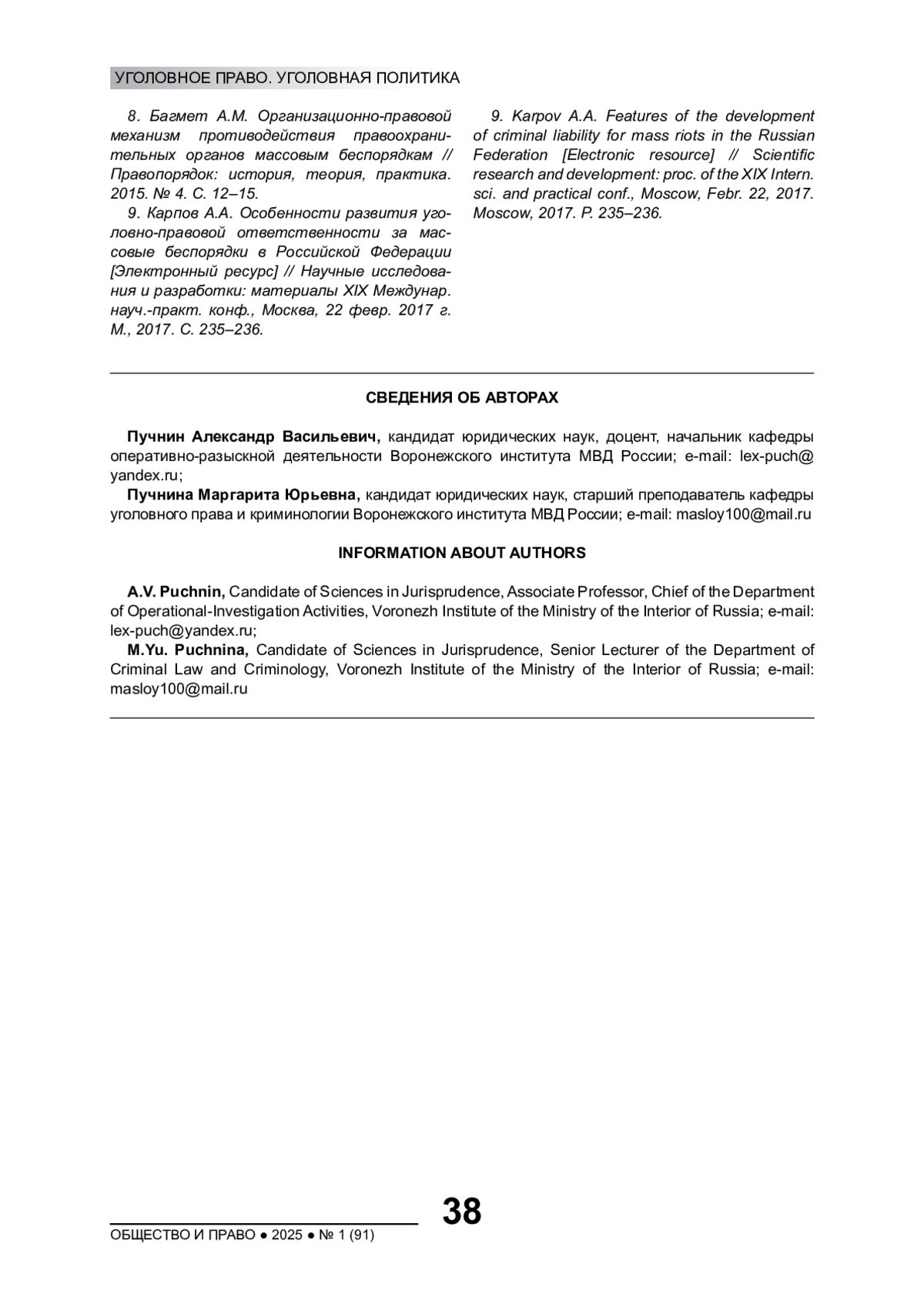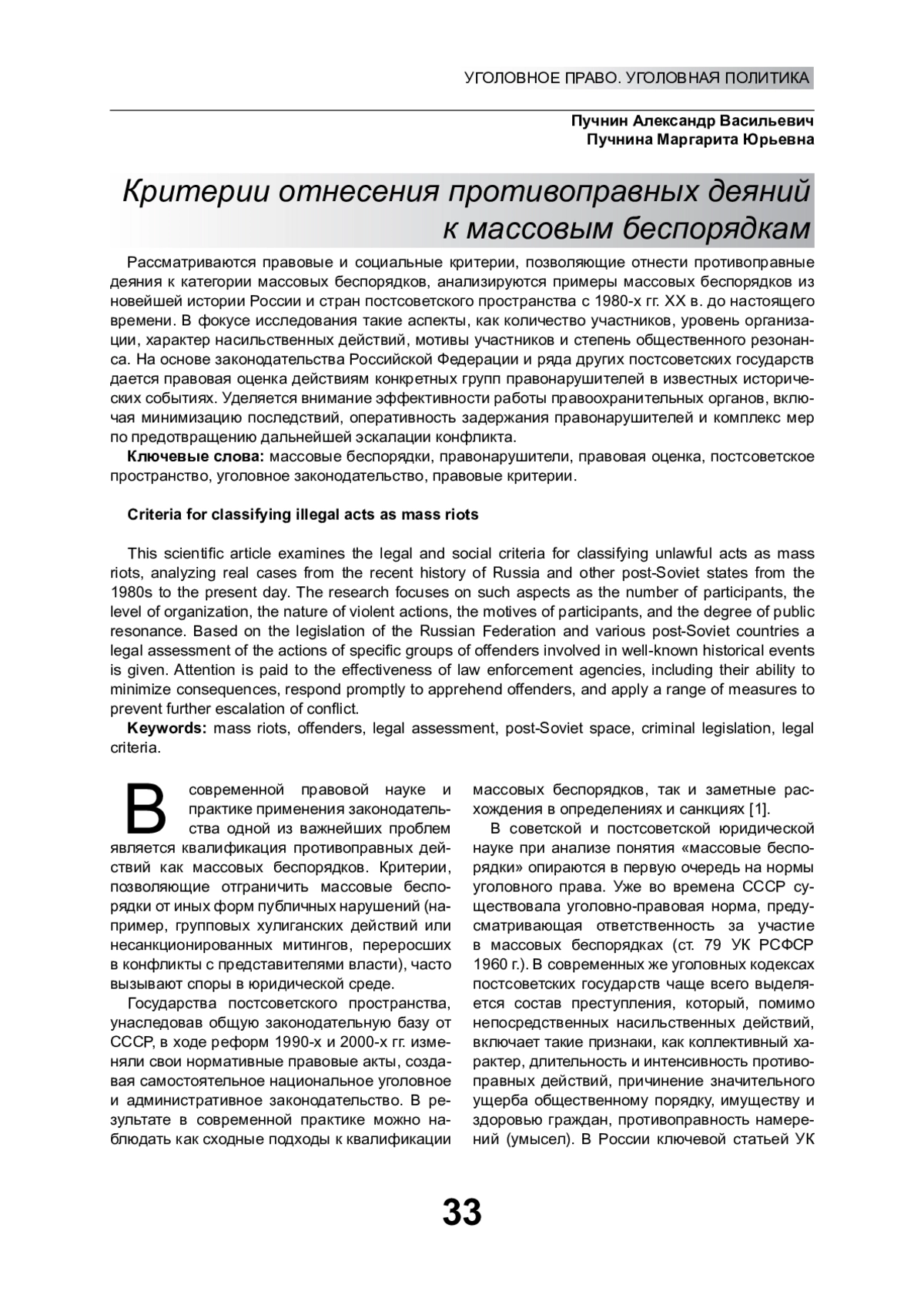ПУЧНИН А. В., ПУЧНИНА М. Ю. КРИТЕРИИ ОТНЕСЕНИЯ ПРОТИВОПРАВНЫХ ДЕЯНИЙ К МАССОВЫМ БЕСПОРЯДКАМ // ОБЩЕСТВО И ПРАВО. 2025. № 1 (91)