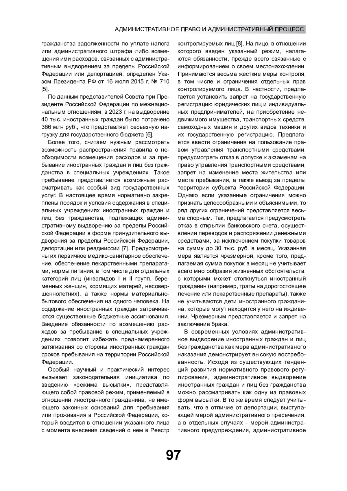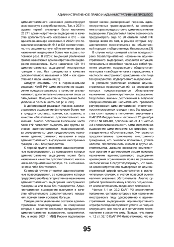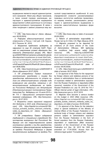 Статья: СОВРЕМЕННОЕ СОСТОЯНИЕ И ПЕРСПЕКТИВЫ СОВЕРШЕНСТВОВАНИЯ ПРАВОВОГО РЕГУЛИРОВАНИЯ АДМИНИСТРАТИВНОГО ВЫДВОРЕНИЯ И ВЫСЫЛКИ ИНОСТРАННЫХ ГРАЖДАН И ЛИЦ БЕЗ ГРАЖДАНСТВА (2025)