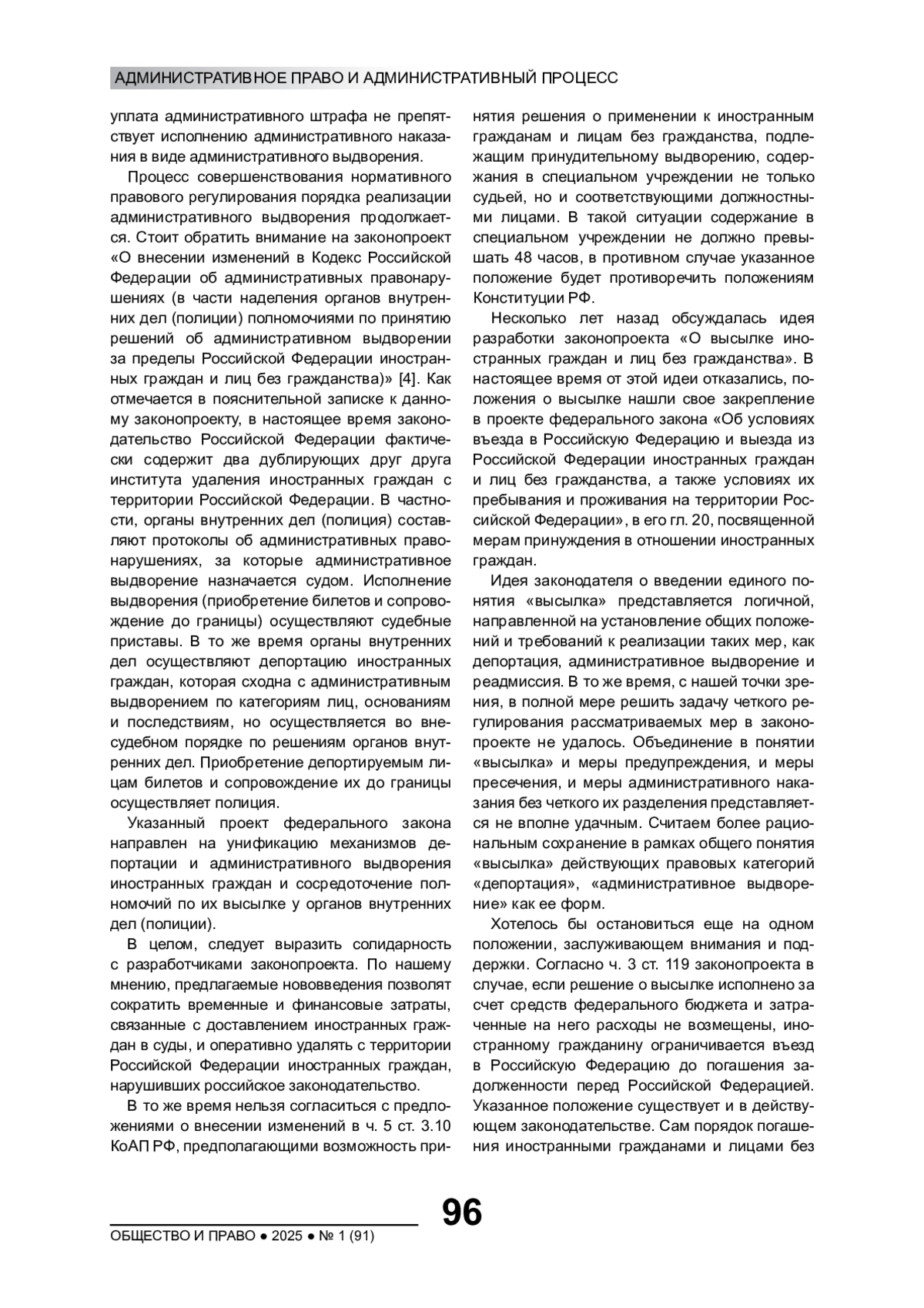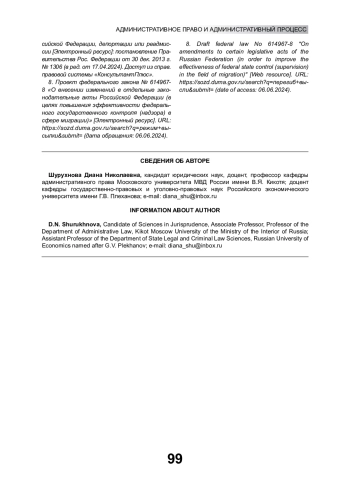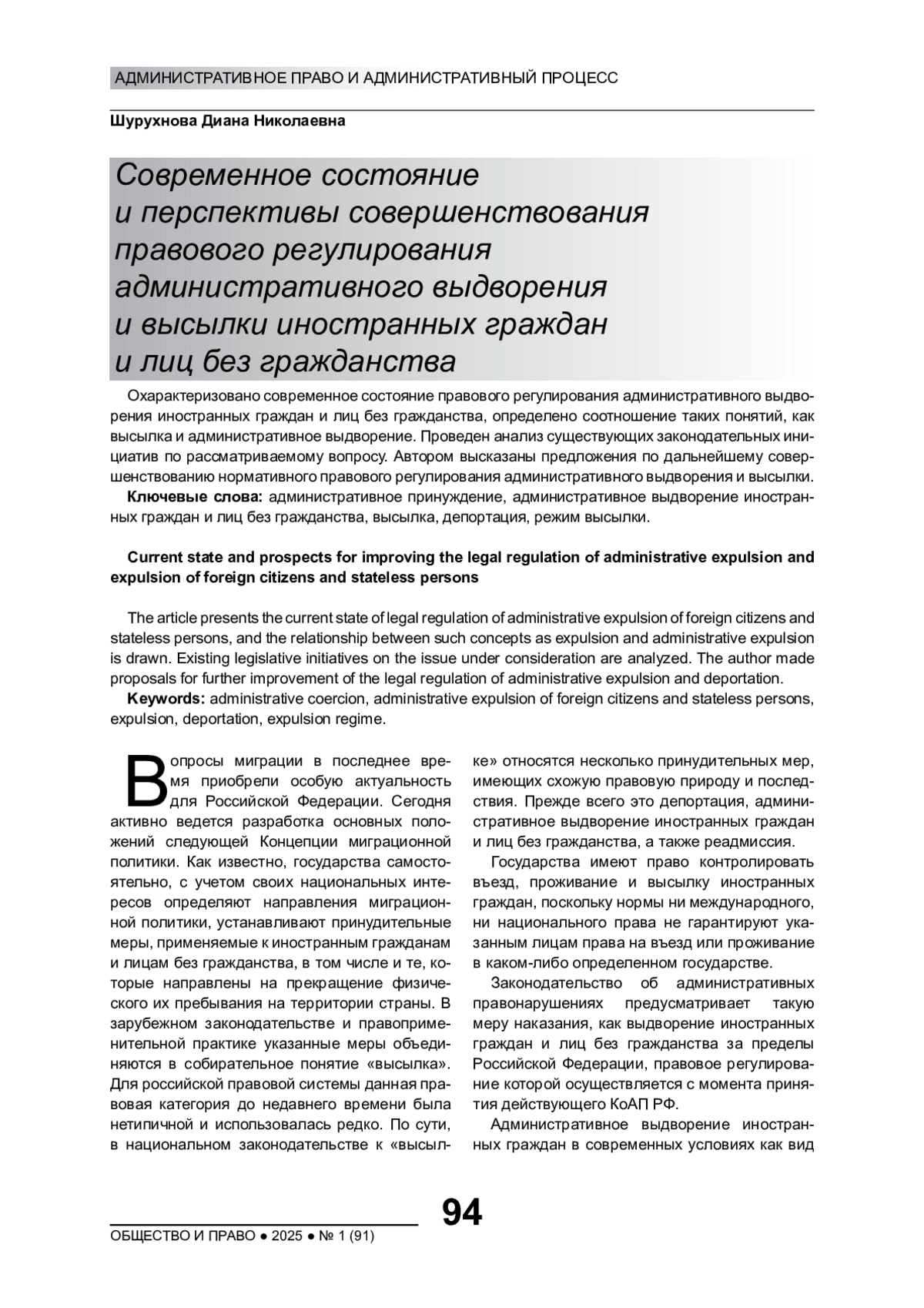 ШУРУХНОВА Д. Н. СОВРЕМЕННОЕ СОСТОЯНИЕ И ПЕРСПЕКТИВЫ СОВЕРШЕНСТВОВАНИЯ ПРАВОВОГО РЕГУЛИРОВАНИЯ АДМИНИСТРАТИВНОГО ВЫДВОРЕНИЯ И ВЫСЫЛКИ ИНОСТРАННЫХ ГРАЖДАН И ЛИЦ БЕЗ ГРАЖДАНСТВА // ОБЩЕСТВО И ПРАВО. 2025. № 1 (91)