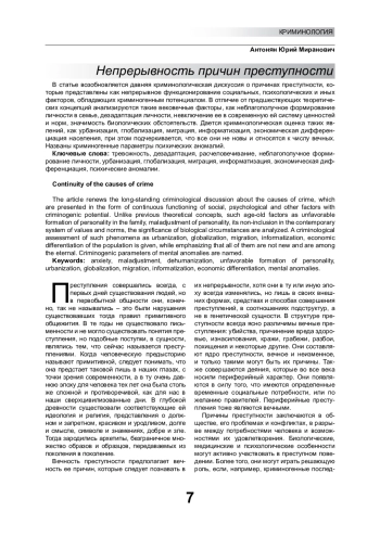 В статье возобновляется давняя криминологическая дискуссия о причинах преступности, которые представлены как непрерывное функционирование социальных, психологических и иных факторов, обладающих криминогенным потенциалом. В отличие от предшествующих теоретических концепций анализируются такие вековечные факторы, как неблагополучное формирование личности в семье, дезадаптация личности, невключение ее в современную ей систему ценностей и норм, значимость биологических обстоятельств. Дается криминологическая оценка таких явлений, как урбанизация, глобализация, миграция, информатизация, экономическая дифференциация населения, при этом подчеркивается, что все они не новы и относятся к числу вечных. Названы криминогенные параметры психических аномалий