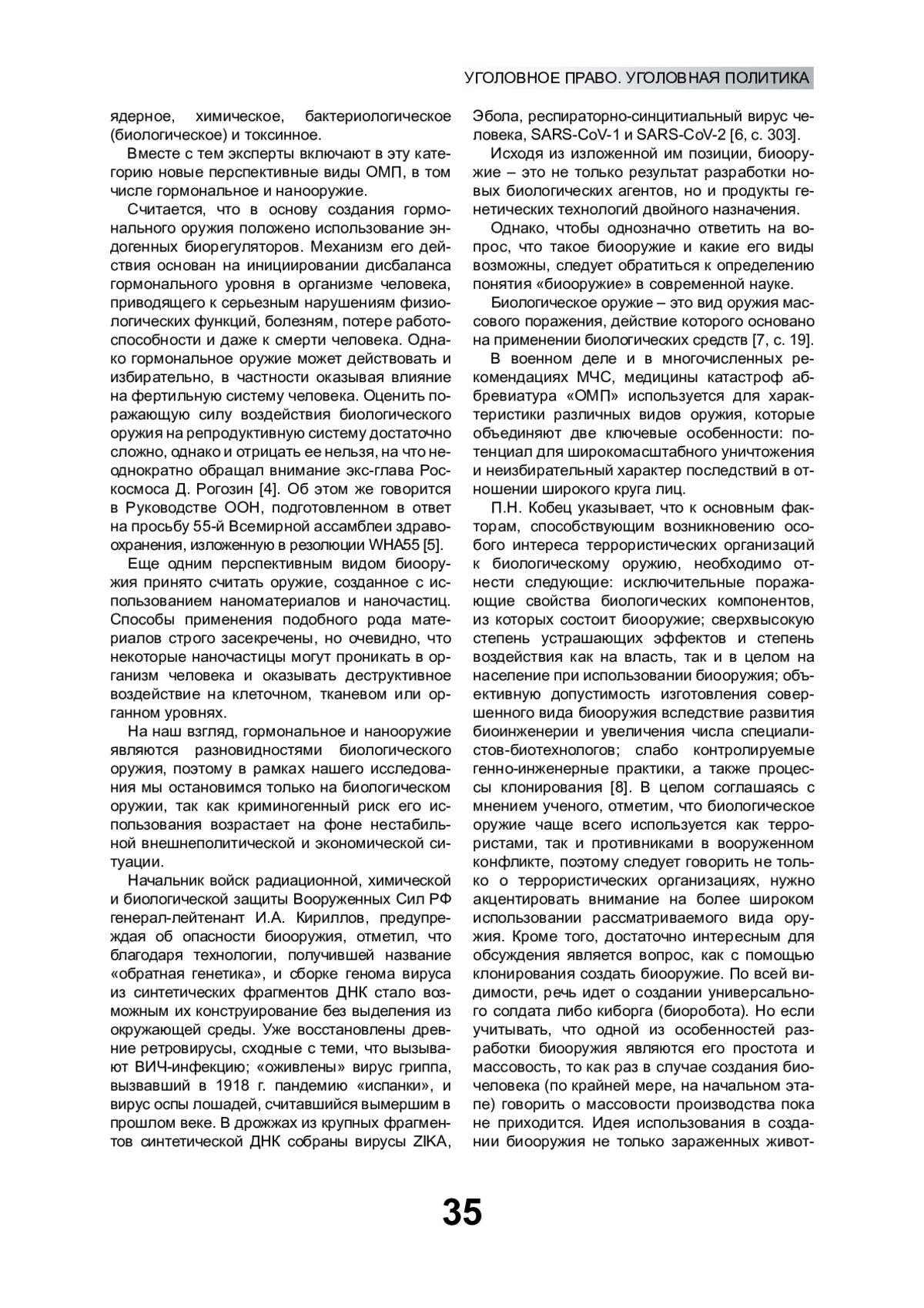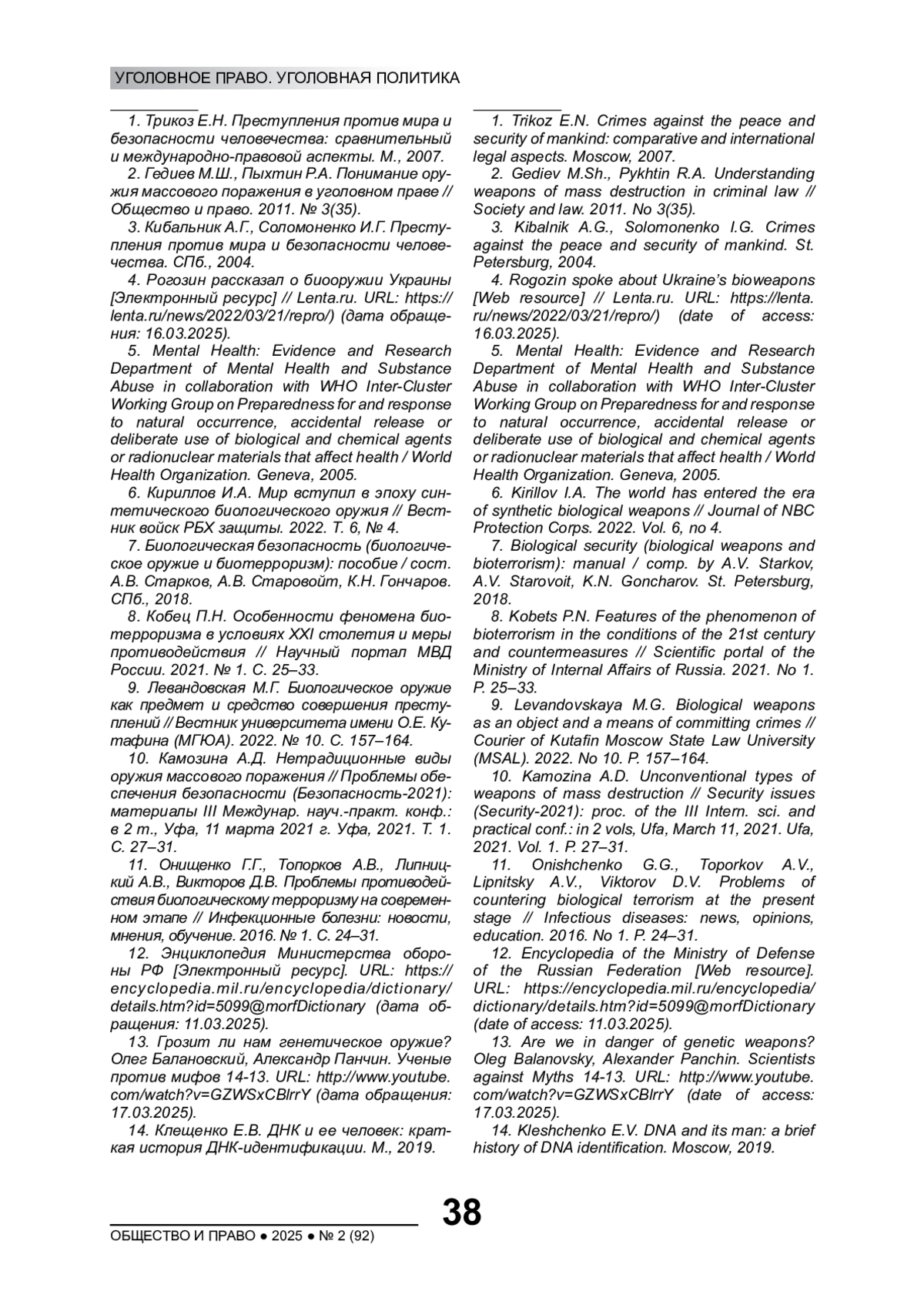 9. Левандовская М.Г. Биологическое оружие как предмет и средство совершения преступлений // Вестник университета имени О.Е. Кутафина (МГЮА). 2022. № 10. С. 157-164. EDN: PJHIJY