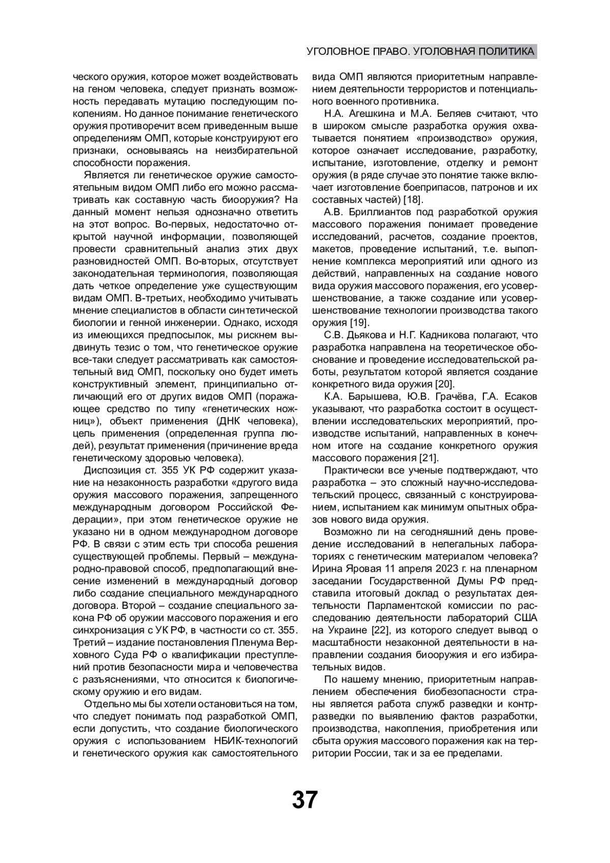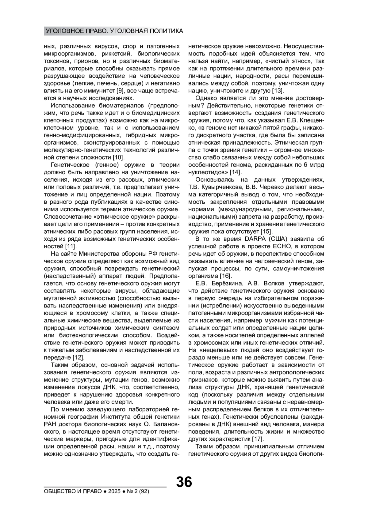 15. Кувырченкова Т.В., Черевко В.В. Генетическое оружие: возможность и действительность // Вестник Московского университета им. С.Ю. Витте. Сер. 2: Юридические науки. 2023. № 2(38). EDN: EGEPYR