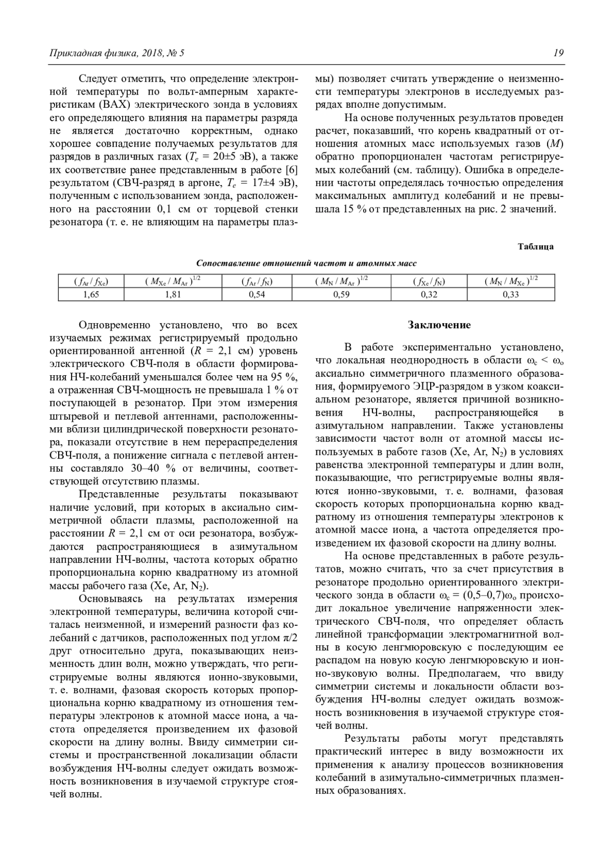 В работе экспериментально установлено, что локальная неоднородность в области ωс < ωо аксиально симметричного плазменного образования, формируемого ЭЦР-разрядом в узком коаксиальном резонаторе, является причиной возникновения НЧ-волны, распространяющейся в азимутальном направлении. Также установлены зависимости частот волн от атомной массы используемых в работе газов (Xe, Ar, N2) в условиях равенства электронной температуры и длин волн, показывающие, что регистрируемые волны являются ионно-звуковыми, т. е. волнами, фазовая скорость которых пропорциональна корню квадратному из отношения температуры электронов к атомной массе иона, а частота определяется произведением их фазовой скорости на длину волны.