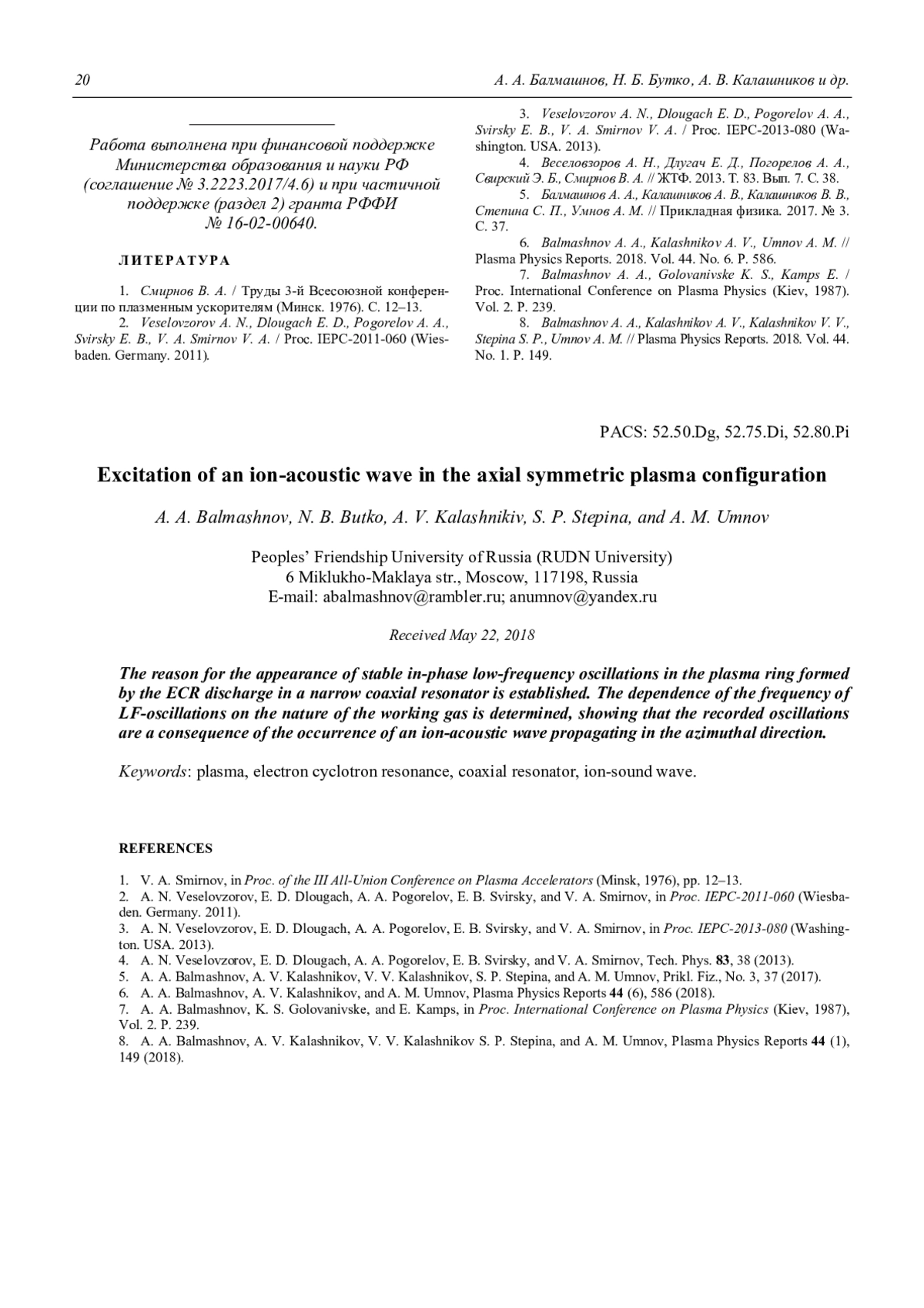 8. Balmashnov A. A., Kalashnikov A. V., Kalashnikov V. V., Stepina S. P., Umnov A. M. // Plasma Physics Reports. 2018. Vol. 44. No. 1. P. 149.