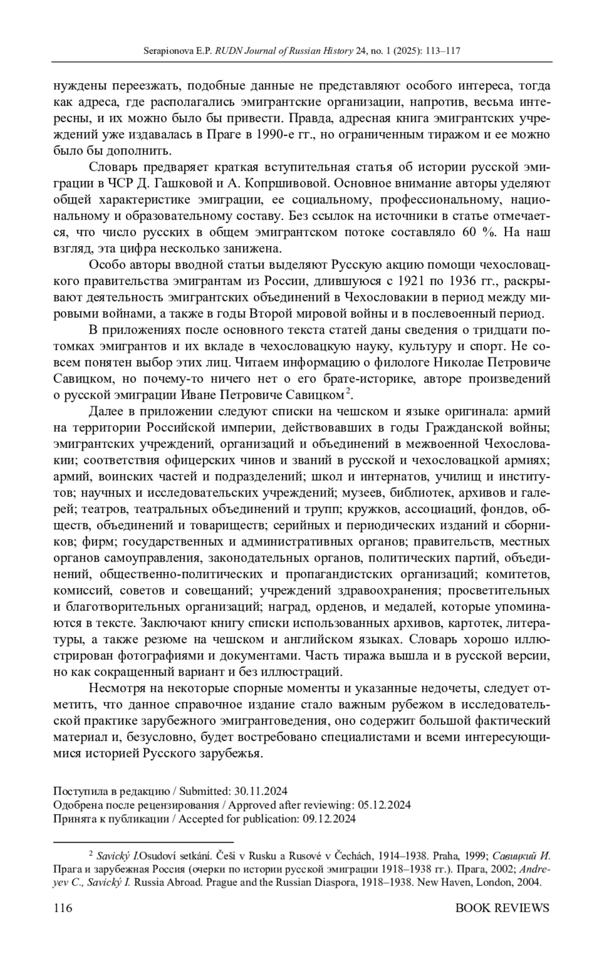СЕРАПИОНОВА Е. П. РЕЦЕНЗИЯ НА КНИГУ: OSOBNOSTI EMIGRACE Z ÚZEMÍ RUSKÉ ŘÍŠE V MEZIVÁLEČNÍM ČESKOSLOVENSKU BIOGRAFICKÝ SLOVNÍK / EDS. DANA HAŠKOVÁ, ANASTAZIE KOPŘIVOVÁ, LJUBOV BĚLOŠEVSKÁ (†), JULIE JANČÁRKOVÁ, SERGEJ GAGEN. PRAHA: SLOVANSKÝ ÚSTAV AV ČR, V. V. I. ACADEMIA, 2023. 750 S. // ВЕСТНИК РОССИЙСКОГО УНИВЕРСИТЕТА ДРУЖБЫ НАРОДОВ. СЕРИЯ: ИСТОРИЯ РОССИИ. 2025. ТОМ 24 № 1