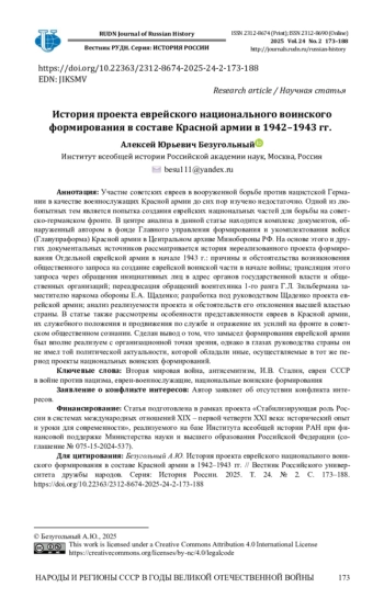 Участие советских евреев в вооруженной борьбе против нацистской Германии в качестве военнослужащих Красной армии до сих пор изучено недостаточно. Одной из любопытных тем является попытка создания еврейских национальных частей для борьбы на советско-германском фронте. В центре анализа в данной статье находится комплекс документов, обнаруженный автором в фонде Главного управления формирования и укомплектования войск (Главупраформа) Красной армии в Центральном архиве Минобороны РФ. На основе этого и других документальных источников рассматривается история нереализованного проекта формирования Отдельной еврейской армии в начале 1943 г.: причины и обстоятельства возникновения общественного запроса на создание еврейской воинской части в начале войны; трансляция этого запроса через обращения инициативных лиц в адрес органов государственной власти и общественных организаций; переадресация обращений воентехника 1-го ранга Г. Л. Зильбермана заместителю наркома обороны Е. А. Щаденко; разработка под руководством Щаденко проекта еврейской армии; анализ реализуемости проекта и обстоятельств его отклонения высшей властью страны. В статье также рассмотрены особенности представленности евреев в Красной армии, их служебного положения и продвижения по службе и отражение их усилий на фронте в советском общественном сознании. Сделан вывод о том, что замысел формирования еврейской армии был вполне реализуем с организационной точки зрения, однако в глазах руководства страны он не имел той политической актуальности, которой обладали иные, осуществляемые в тот же период проекты национальных воинских формирований.