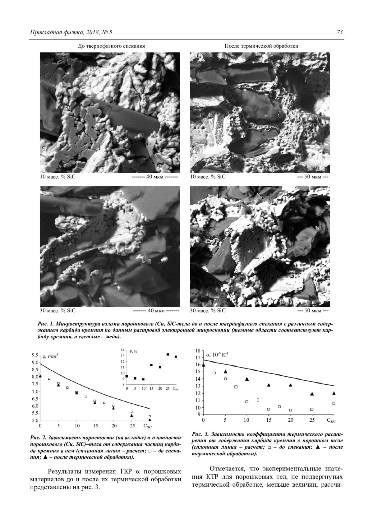 1. Наблюдается убывание плотности порошкового (Cu, SiC)-тела с увеличением содержания SiC, обусловленное свойствами его исходных компонентов. Отмечается, что использование термической обработки не сопровождается изменениями в значениях плотности относительно образцов, не прошедших этап твердофазного спекания.