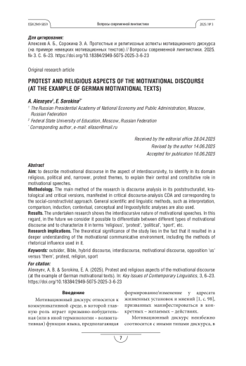 Статья: ПРОТЕСТНЫЕ И РЕЛИГИОЗНЫЕ АСПЕКТЫ МОТИВАЦИОННОГО ДИСКУРСА (НА ПРИМЕРЕ НЕМЕЦКИХ МОТИВАЦИОННЫХ ТЕКСТОВ) (2025)