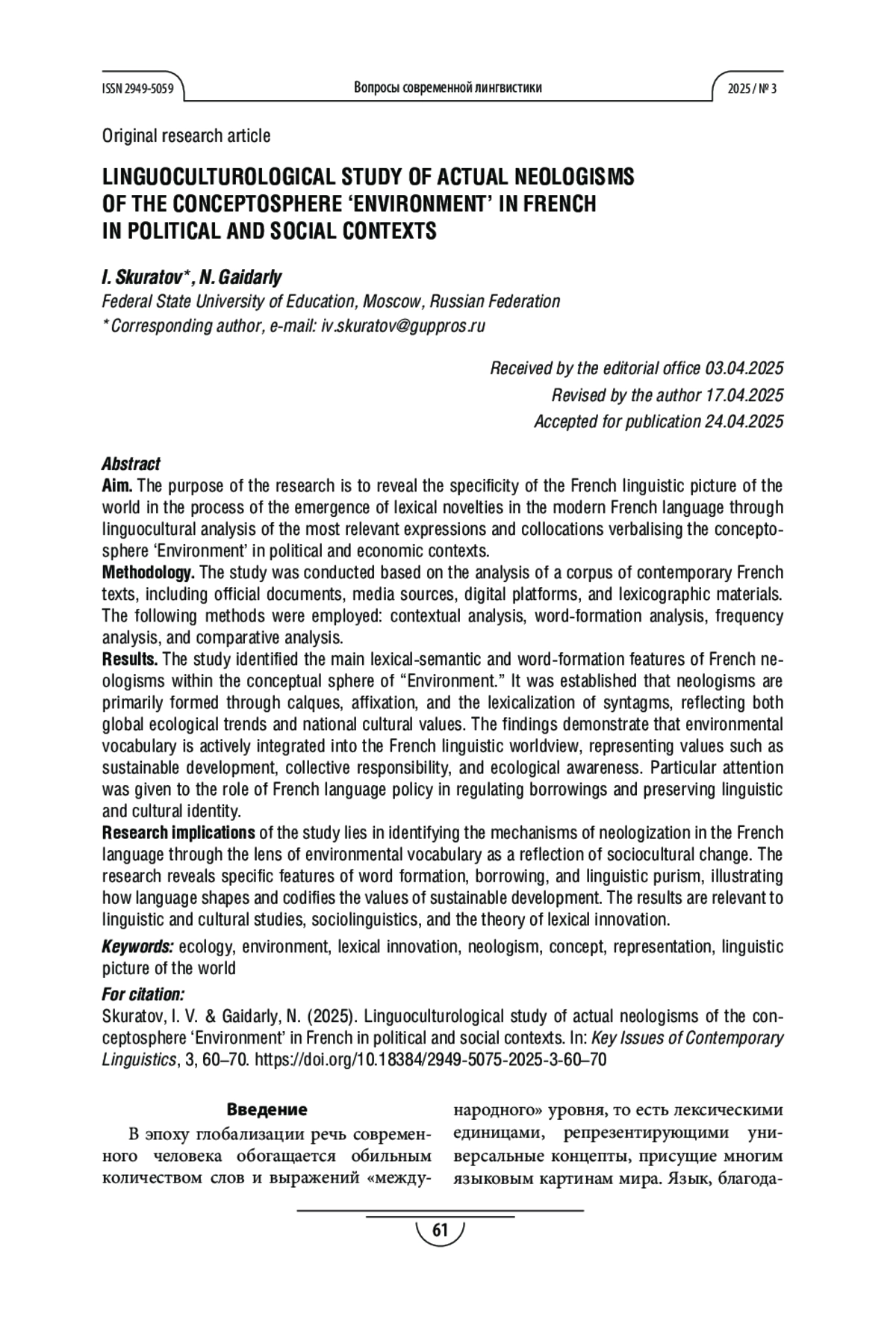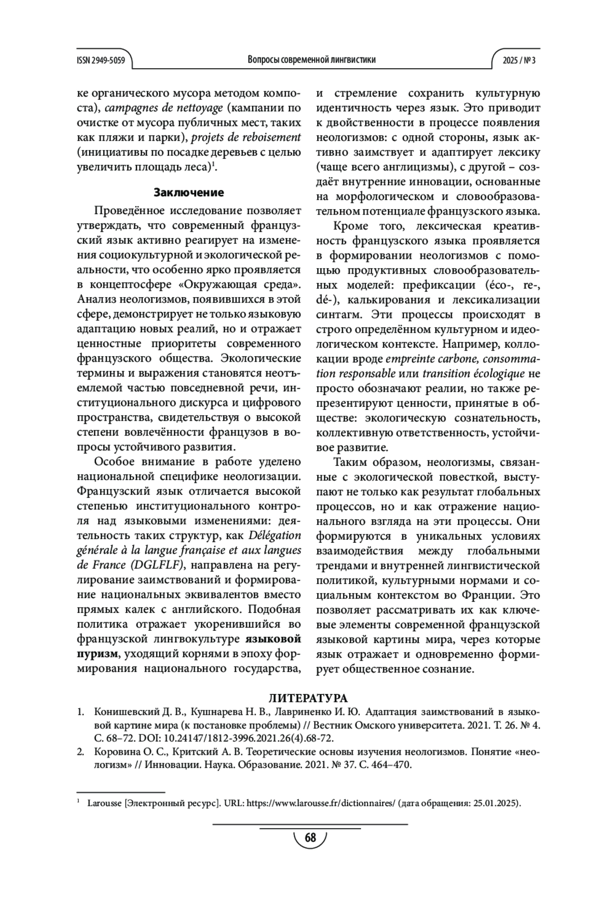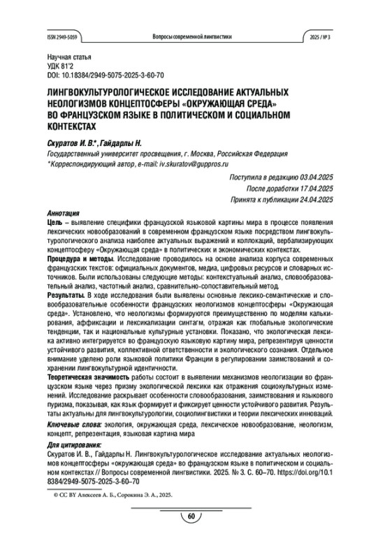 СКУРАТОВ И. В., ГАЙДАРЛЫ Н. В. ЛИНГВОКУЛЬТУРОЛОГИЧЕСКОЕ ИССЛЕДОВАНИЕ АКТУАЛЬНЫХ НЕОЛОГИЗМОВ КОНЦЕПТОСФЕРЫ «ОКРУЖАЮЩАЯ СРЕДА» ВО ФРАНЦУЗСКОМ ЯЗЫКЕ В ПОЛИТИЧЕСКОМ И СОЦИАЛЬНОМ КОНТЕКСТАХ // ВОПРОСЫ СОВРЕМЕННОЙ ЛИНГВИСТИКИ. 2025. № 3