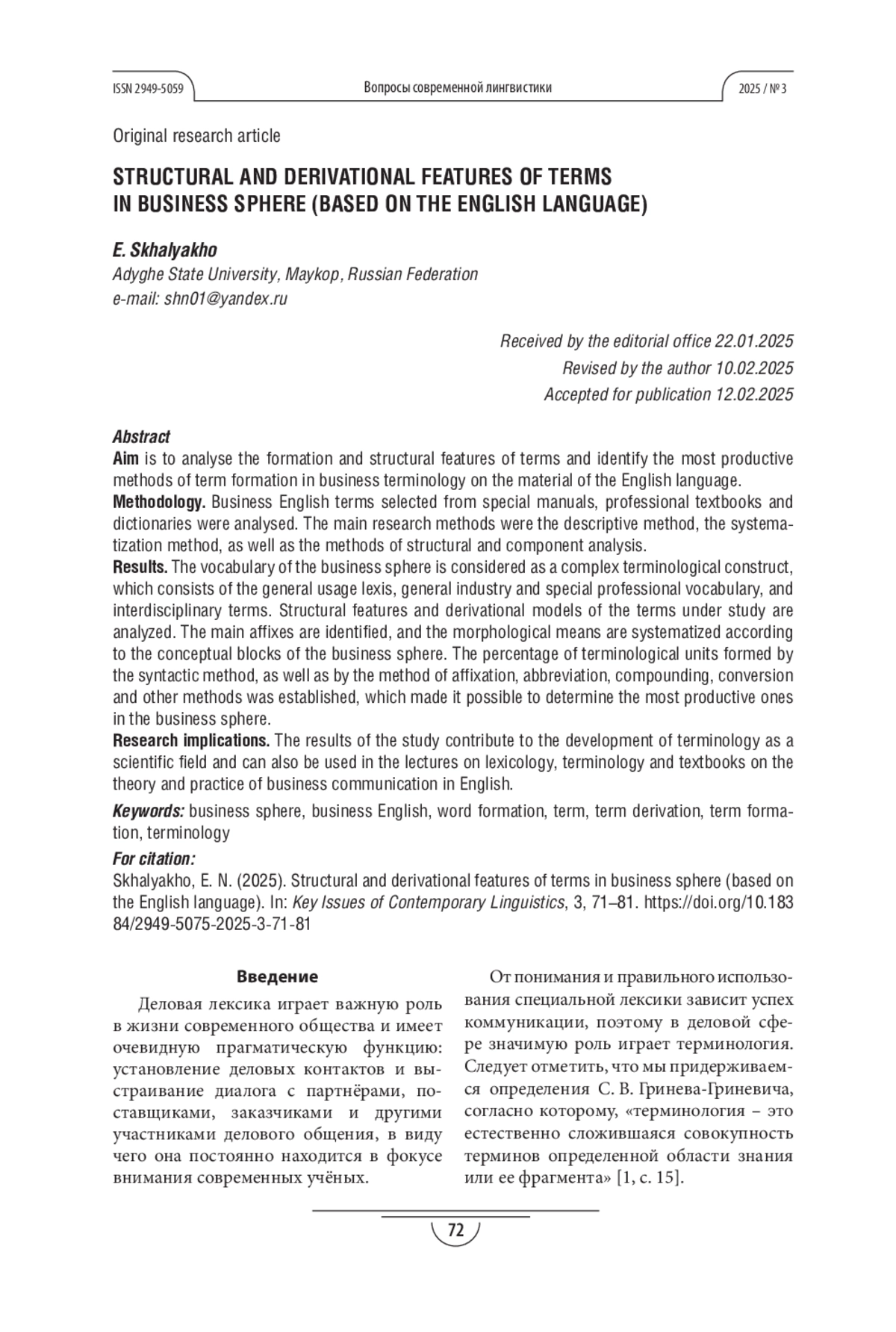 Цель. Проанализировать словообразовательные и структурные особенности производных, сложных и полилексемных терминов и выявить наиболее продуктивные способы терминообразования в сфере современного делового общения на материале английского языка.