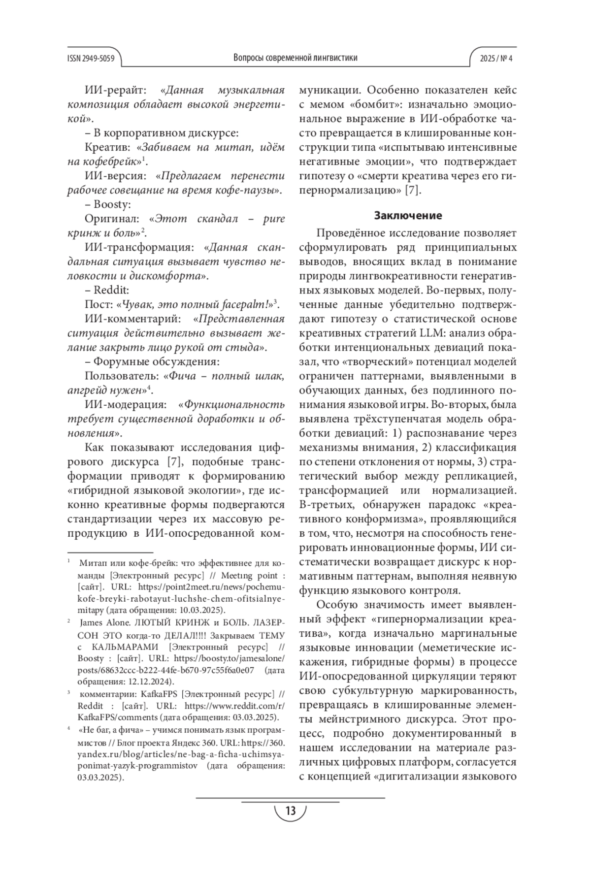 Цель. Настоящее исследование направлено на выявление механизмов обработки интенциональных языковых девиаций большими языковыми моделями (LLM) и анализ их лингво-креативных стратегий в цифровом дискурсе. Цель работы заключается в разработке теоретической модели, объясняющей когнитивные алгоритмы распознавания и трансформации девиаций в системах искусственного интеллекта.