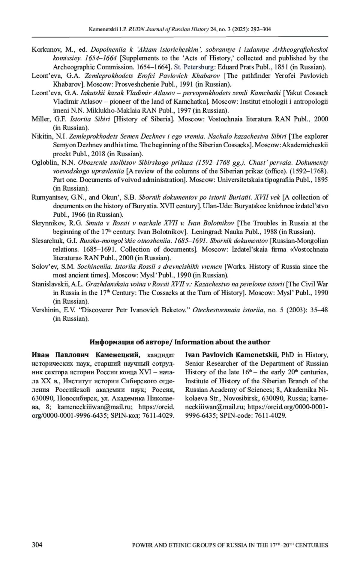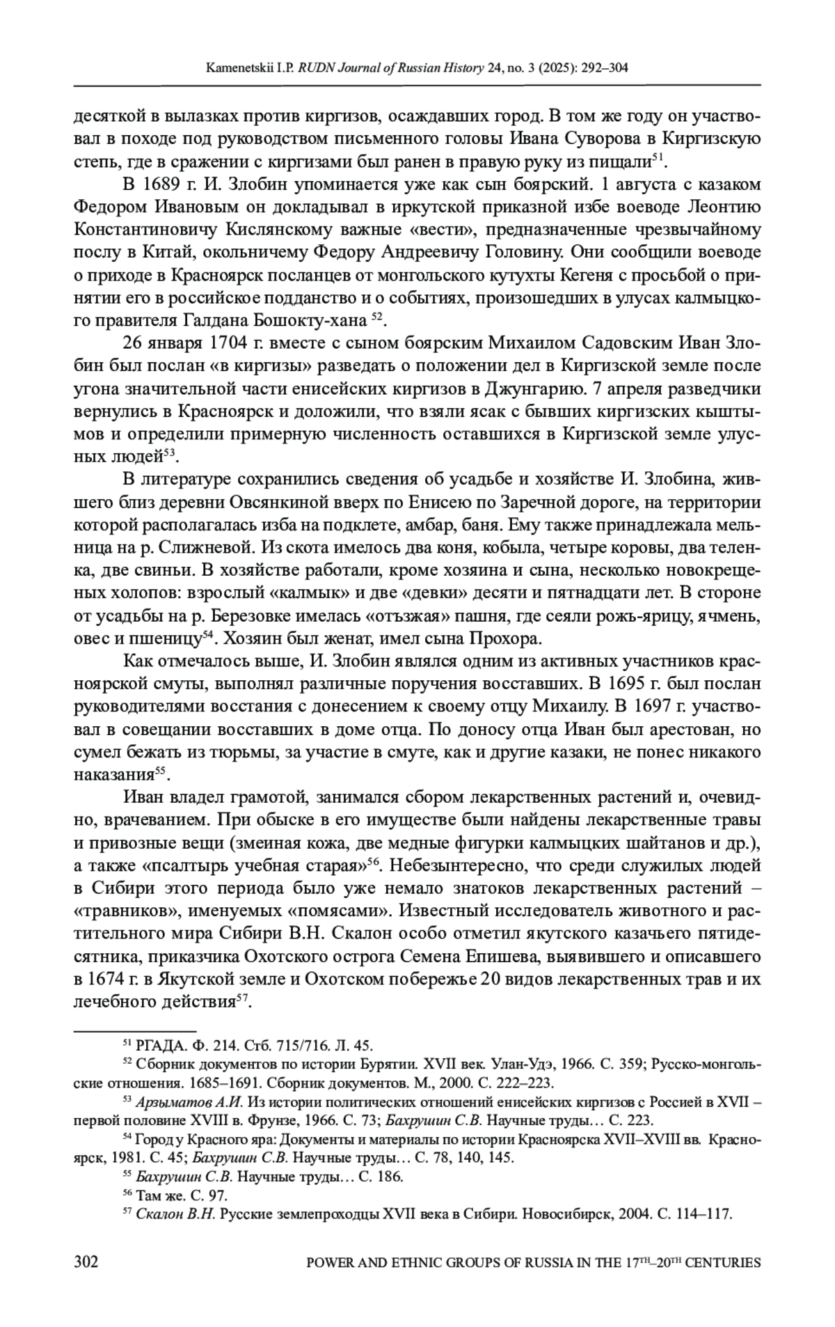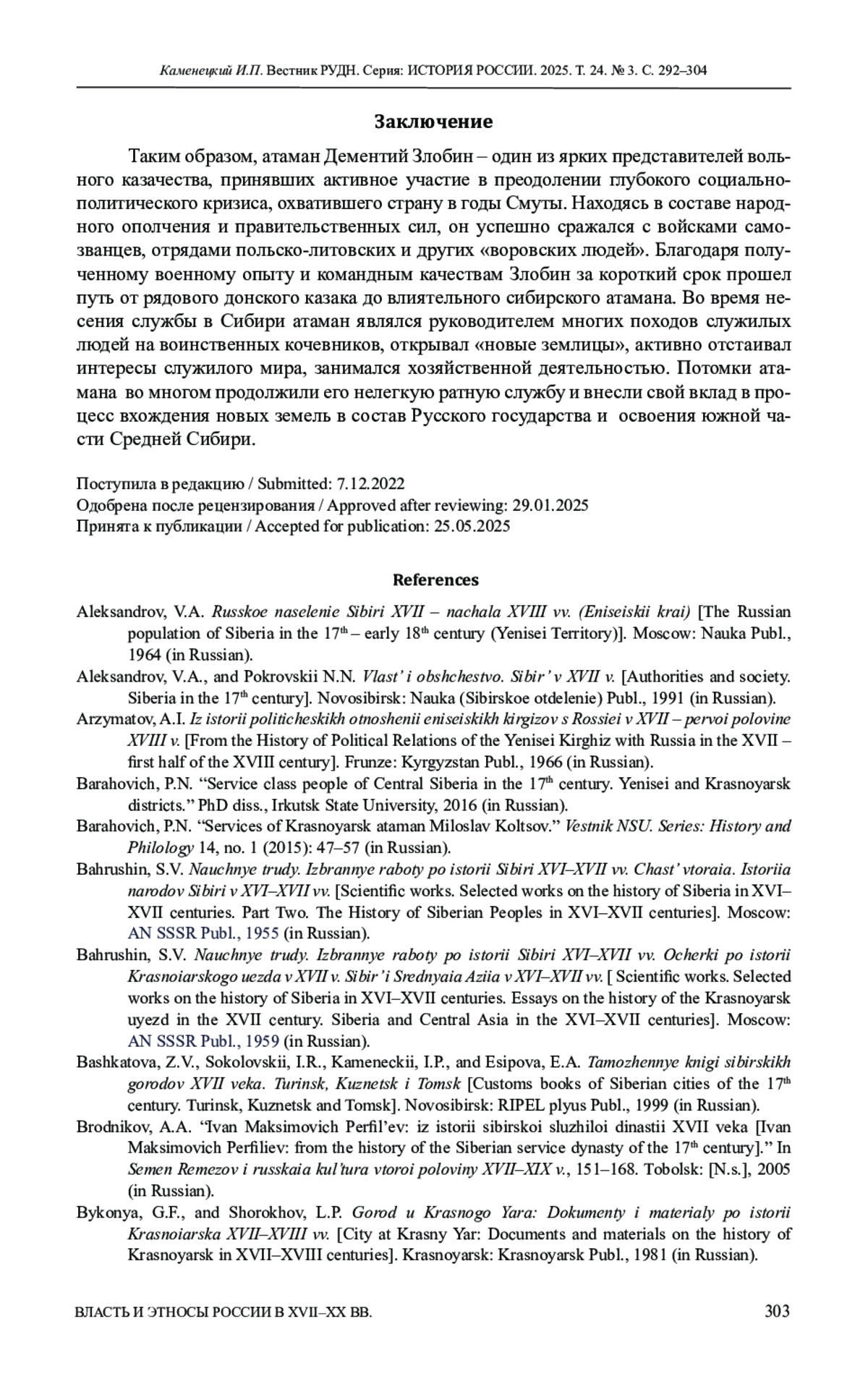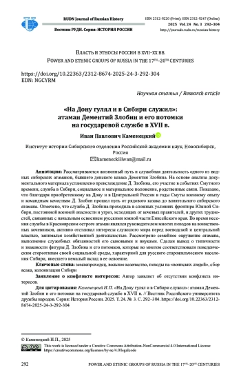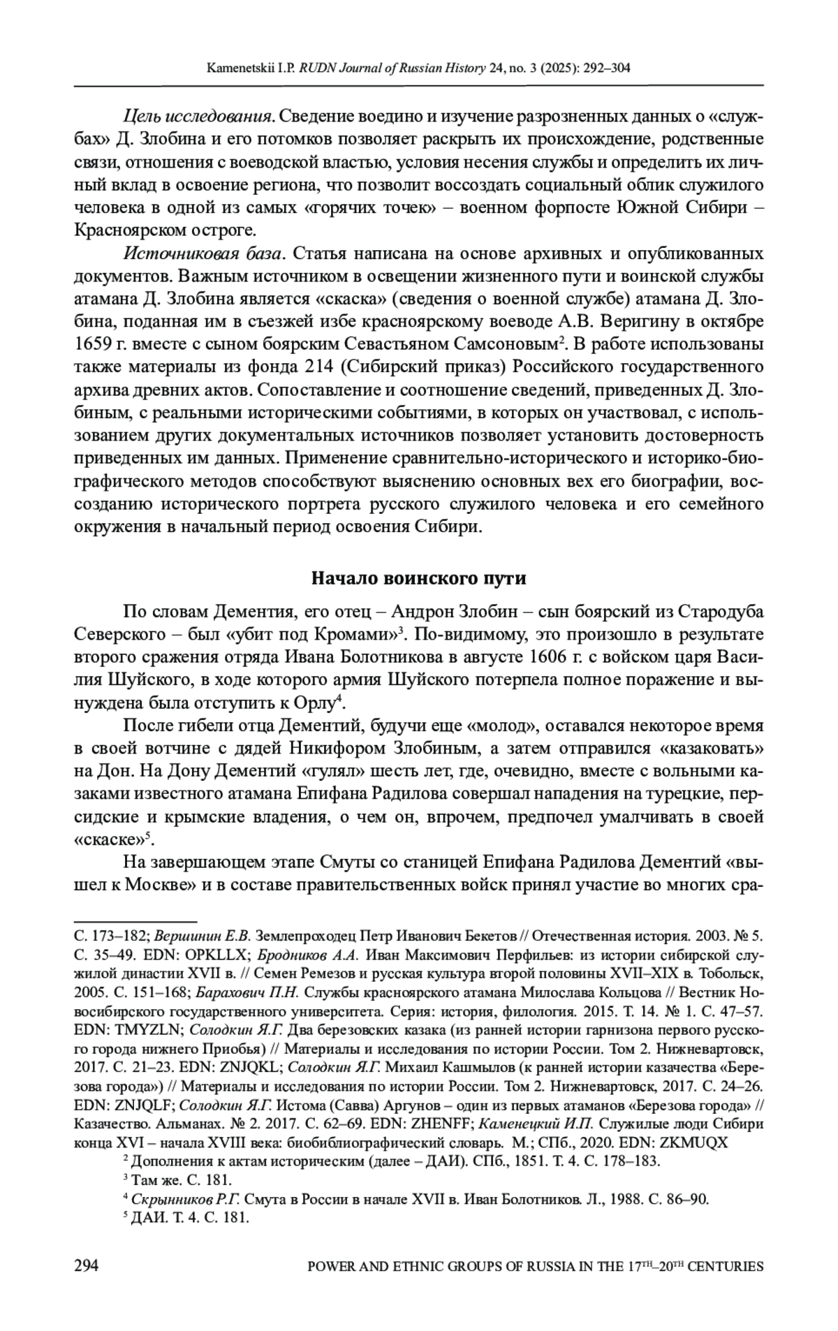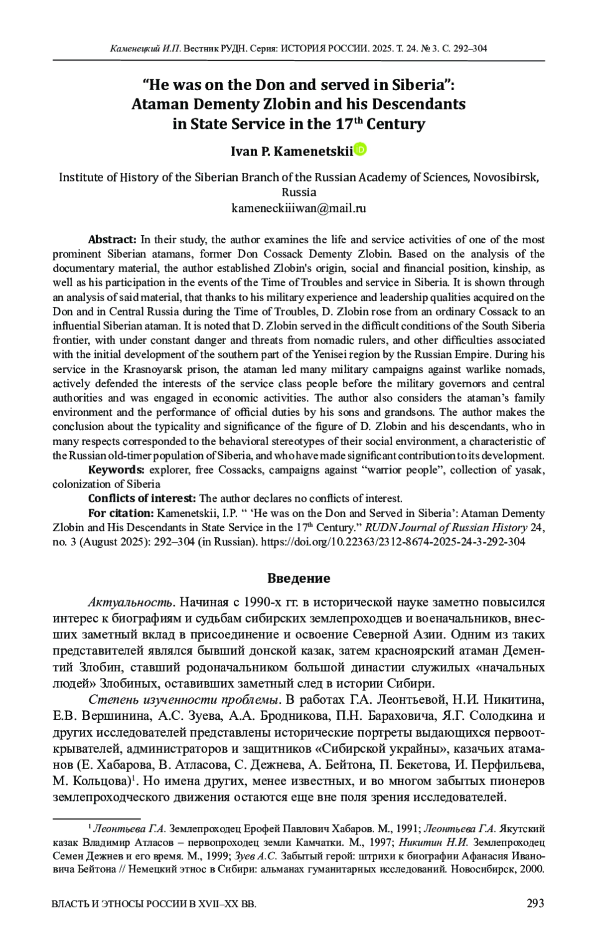 КАМЕНЕЦКИЙ И. П. «НА ДОНУ ГУЛЯЛ И В СИБИРИ СЛУЖИЛ»: АТАМАН ДЕМЕНТИЙ ЗЛОБИН И ЕГО ПОТОМКИ НА ГОСУДАРЕВОЙ СЛУЖБЕ В XVII В. // ВЕСТНИК РОССИЙСКОГО УНИВЕРСИТЕТА ДРУЖБЫ НАРОДОВ. СЕРИЯ: ИСТОРИЯ РОССИИ. 2025. ТОМ 24 № 3