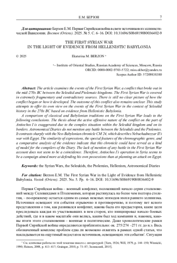 Статья посвящена рассмотрению событий Первой Сирийской войны – конфликта, вспыхнувшего в середине 270-х гг. до н. э. и положившего начало серии столкновений между двумя крупнейшими эллинистическими державами, царствами Селевкидов и Птолемеев. Первая Сирийская война, как и многие эпизоды эпохи раннего эллинизма, освещена в источниках крайне отрывочно и противоречиво, из-за чего в историографии нет ясной картины того, как развивался этот конфликт: какова была его предыстория, какие цели преследовали каждая из участвовавших в нем сторон, кто инициировал начало военных действий, каким был ход кампании и, наконец, каковы были итоги этого столкновения – военные и политические. В настоящем исследовании предпринимается попытка предложить собственный взгляд на некоторые вопросы, связанные с Первой Сирийской войной, в первую очередь, в контексте селевкидской истории 270-х гг. до н. э.