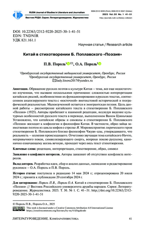 Обращение русских поэтов к культуре Китая - тема, все еще недостаточно изученная, что вызвано несколькими причинами: сложностью интерпретации китайских реалий, особенностями их функционирования в русских текстах, соотнесением анализируемого текста с «восточной» внетекстовой исторической и географической реальностью. Малоизученной остается и эмигрантская поэзия.