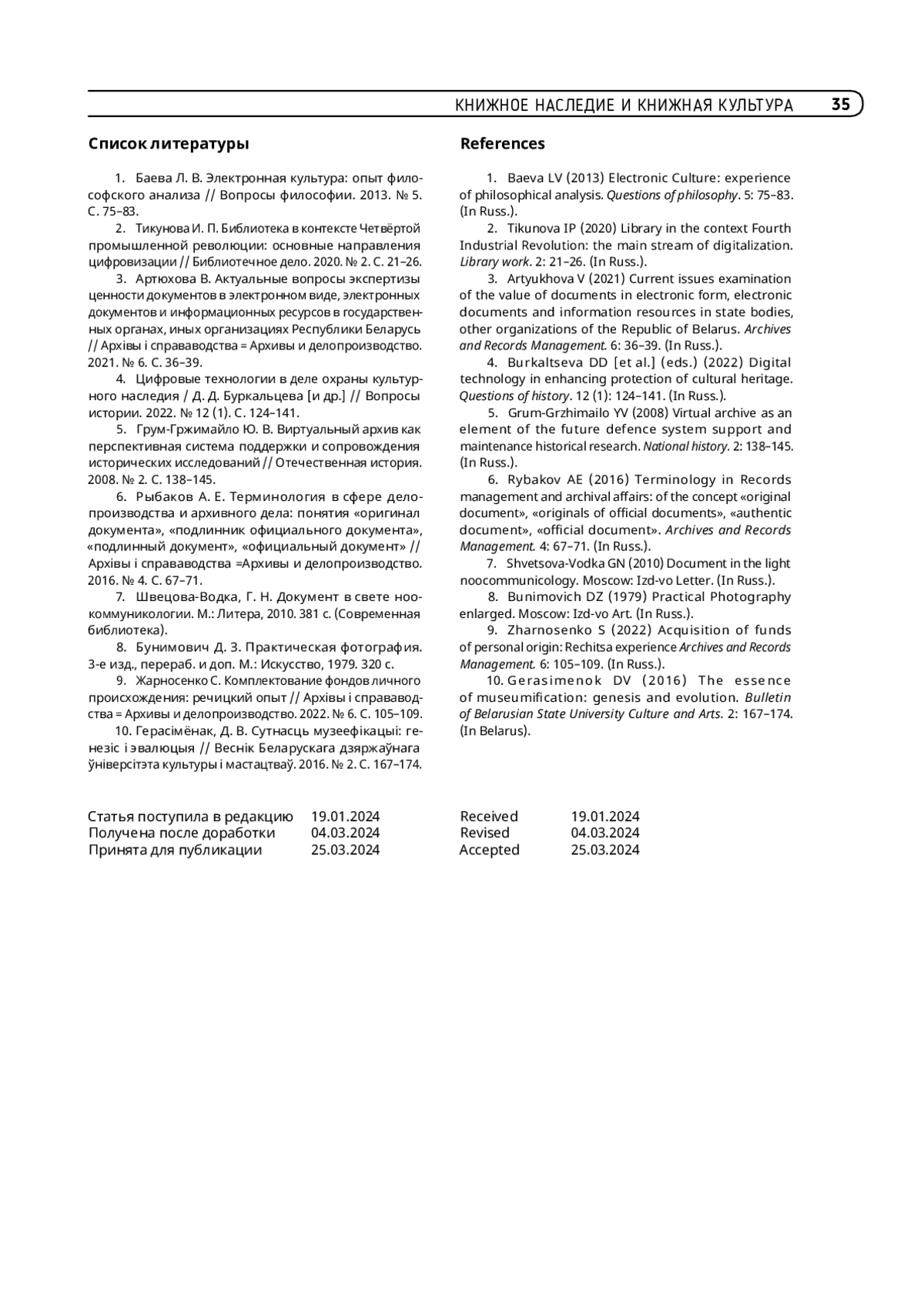 10. Герасімёнак Д. В. Сутнасць музеефікацыі: генезіс і эвалюцыя // Веснік Беларускага дзяржаўнага ўніверсітэта культуры і мастацтваў. 2016. № 2. С. 167-174.