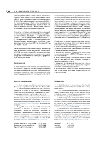 По данным Научной электронной библиотеки (НЭБ) eLIBRARY. RU, в рубрике ГРНТИ «13.31.00 Библиотечное дело. Библиотековедение» представлено 80 журналов, из них только 6 журналов выпускаются региональными библиотеками, включая НБ РС(Я), центральные библиотеки Кузбасса, Карелии, Татарстана, Бурятии, Хабаровского края.
