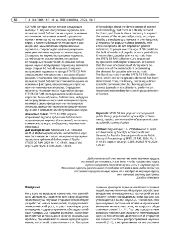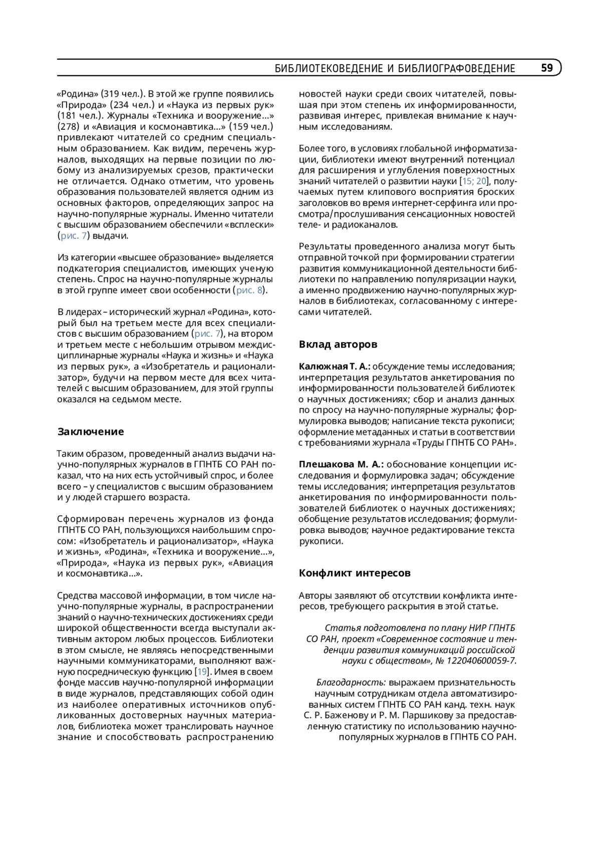 Опрос, проведенный сотрудниками Государственной публичной научно-технической библиотеки Сибирского отделения Российской академии наук (ГПНТБ СО РАН) в 2022 г. среди читателей публичных библиотек г. Новосибирска [15], показал, что 66,2 % из них время от времени читают научнопопулярные книги, журналы и газеты.