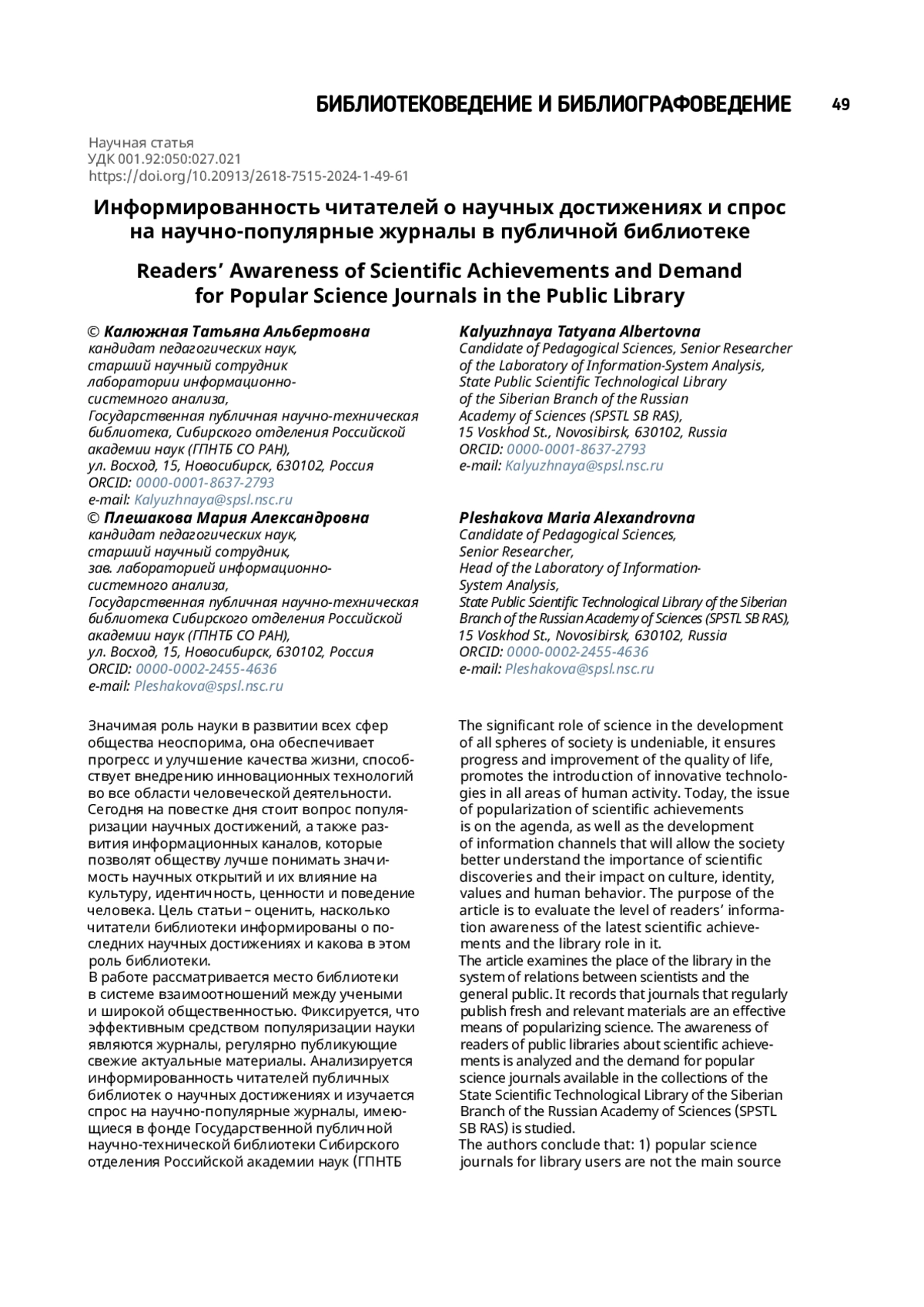 Значимая роль науки в развитии всех сфер общества неоспорима, она обеспечивает прогресс и улучшение качества жизни, способствует внедрению инновационных технологий во все области человеческой деятельности. Сегодня на повестке дня стоит вопрос популяризации научных достижений, а также развития информационных каналов, которые позволят обществу лучше понимать значимость научных открытий и их влияние на культуру, идентичность, ценности и поведение человека. Цель статьи – оценить, насколько читатели библиотеки информированы о последних научных достижениях и какова в этом роль библиотеки. В работе рассматривается место библиотеки в системе взаимоотношений между учеными и широкой общественностью. Фиксируется, что эффективным средством популяризации науки являются журналы, регулярно публикующие свежие актуальные материалы. Анализируется информированность читателей публичных библиотек о научных достижениях и изучается спрос на научно-популярные журналы, имеющиеся в фонде Государственной публичной научно-технической библиотеки Сибирского отделения Российской академии наук (ГПНТБ СО РАН). Авторы статьи делают следующие выводы: 1) научно-популярные журналы для пользователей библиотек не служат основным источником получения знаний о развитии науки и техники, но на них есть устойчивый спрос, а также наблюдается тенденция к расширению наименований спрашиваемых журналов, сопровождающаяся одновременным увеличением выдачи их экземпляров; 2) запросы на научно-популярные журналы, за небольшим исключением, не зависят от гендерных показателей; 3) самыми читающими научно-популярную периодику являются люди старше 60 лет; 4) чаще всего научно-популярные журналы из фонда ГПНТБ СО РАН запрашивают специалисты с высшим образованием. Отмечается, что уровень образования пользователей библиотек становится одним из основных факторов, определяющих спрос на научно-популярные журналы. Определен перечень периодических изданий из фонда ГПНТБ СО РАН, пользующихся наибольшим спросом. Таким образом, библиотека, не будучи непосредственным научным коммуникатором, но имея в своем фонде научно-популярные журналы, выполняет важную посредническую функцию в направлении популяризации науки.