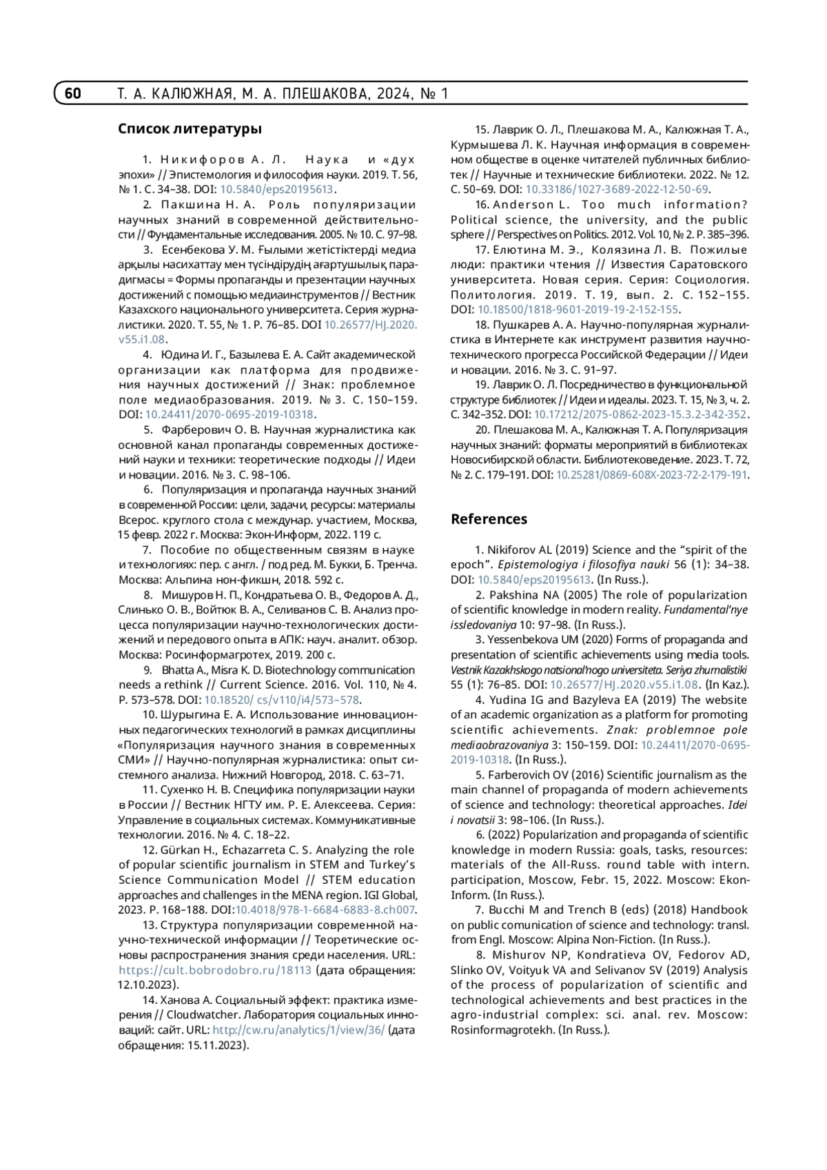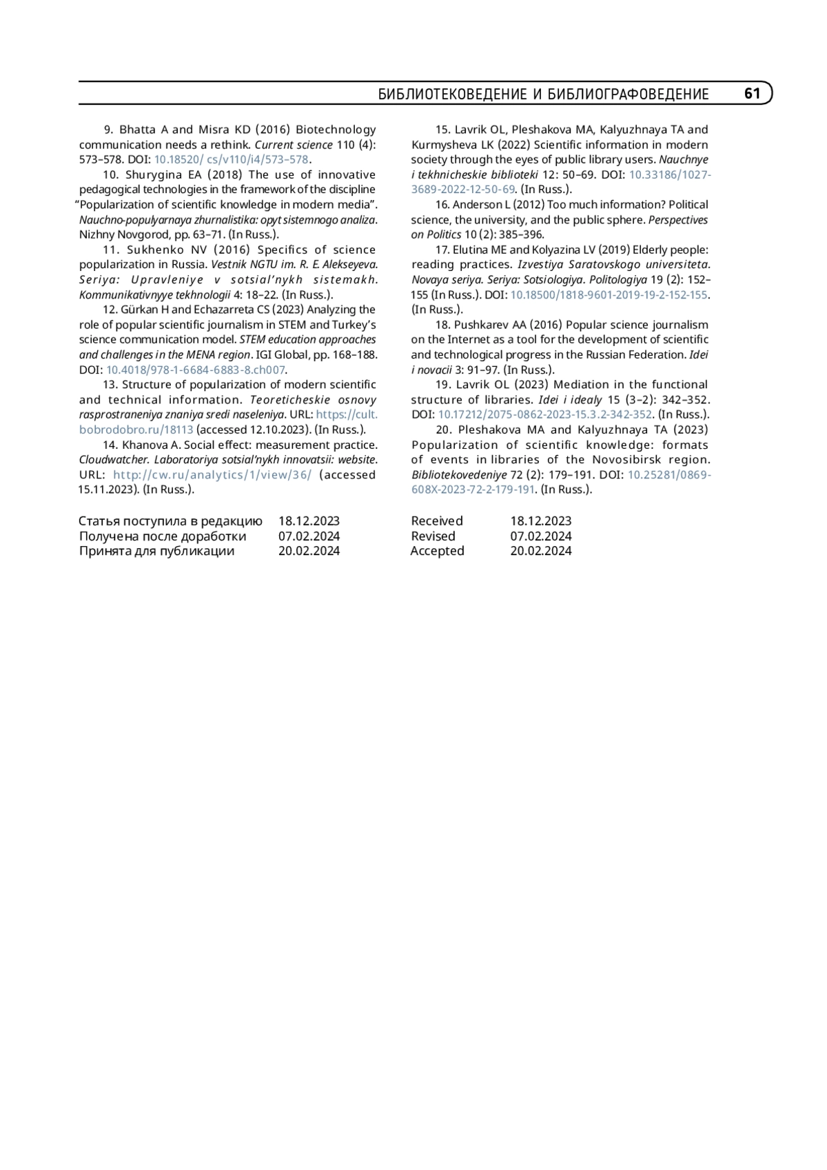 20. Плешакова М. А., Калюжная Т. А. Популяризация научных знаний: форматы мероприятий в библиотеках Новосибирской области. Библиотековедение. 2023. Т. 72, № 2. С. 179-191. https://doi.org/10.25281/0869-608X-2023-72-2-179-191.