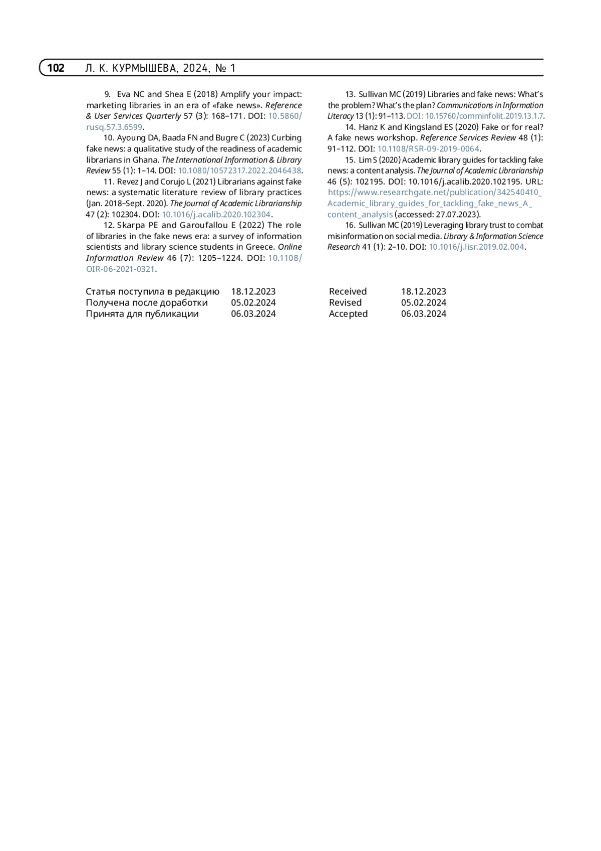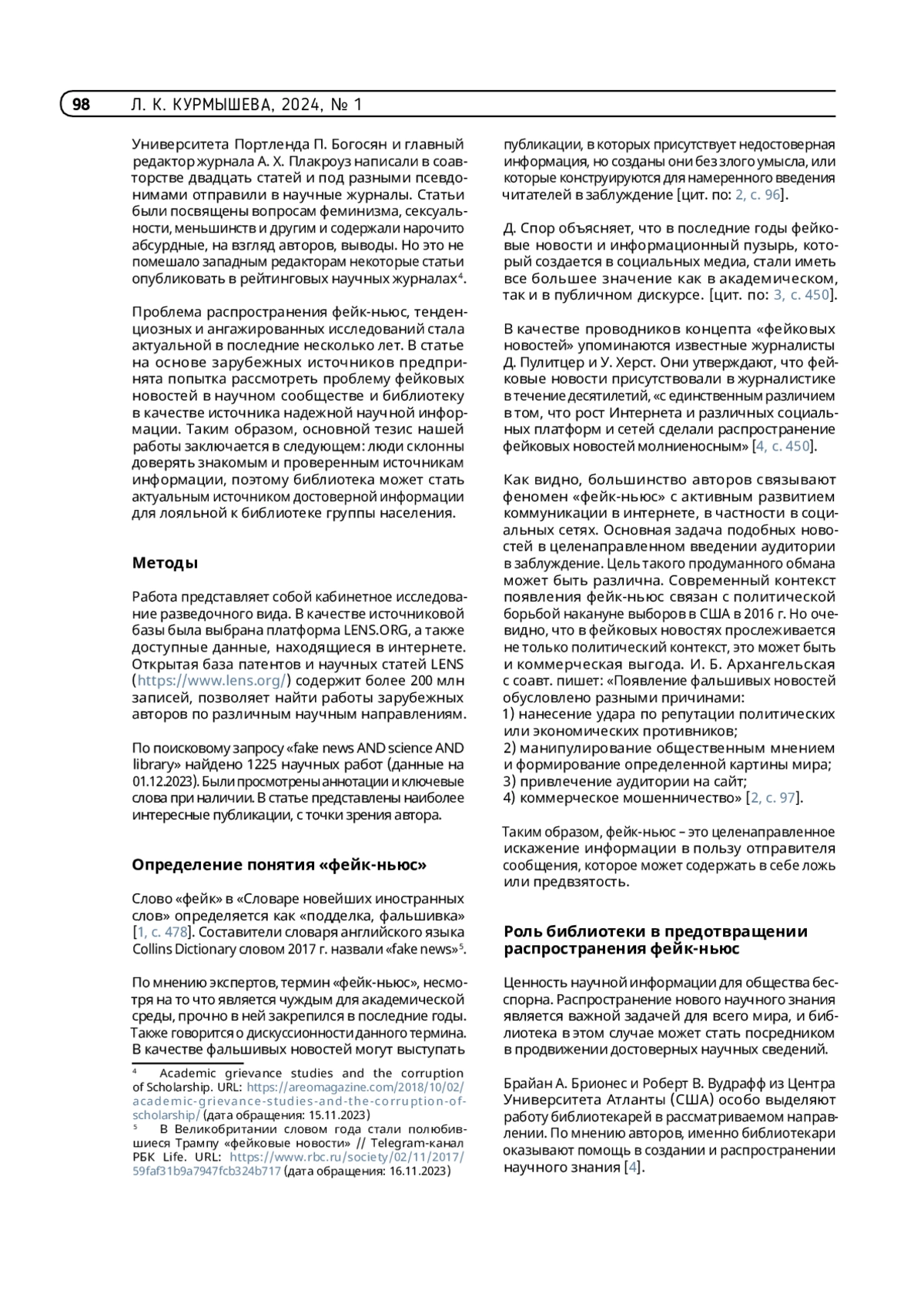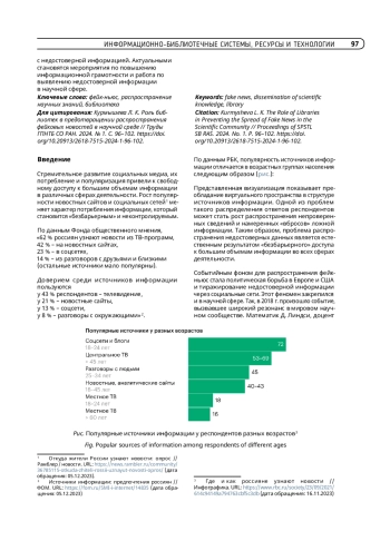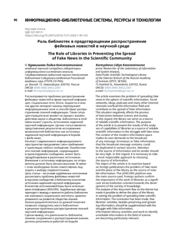 КУРМЫШЕВА Л. К. РОЛЬ БИБЛИОТЕК В ПРЕДОТВРАЩЕНИИ РАСПРОСТРАНЕНИЯ ФЕЙКОВЫХ НОВОСТЕЙ В НАУЧНОЙ СРЕДЕ // ТРУДЫ ГПНТБ СО РАН. 2024. № 1