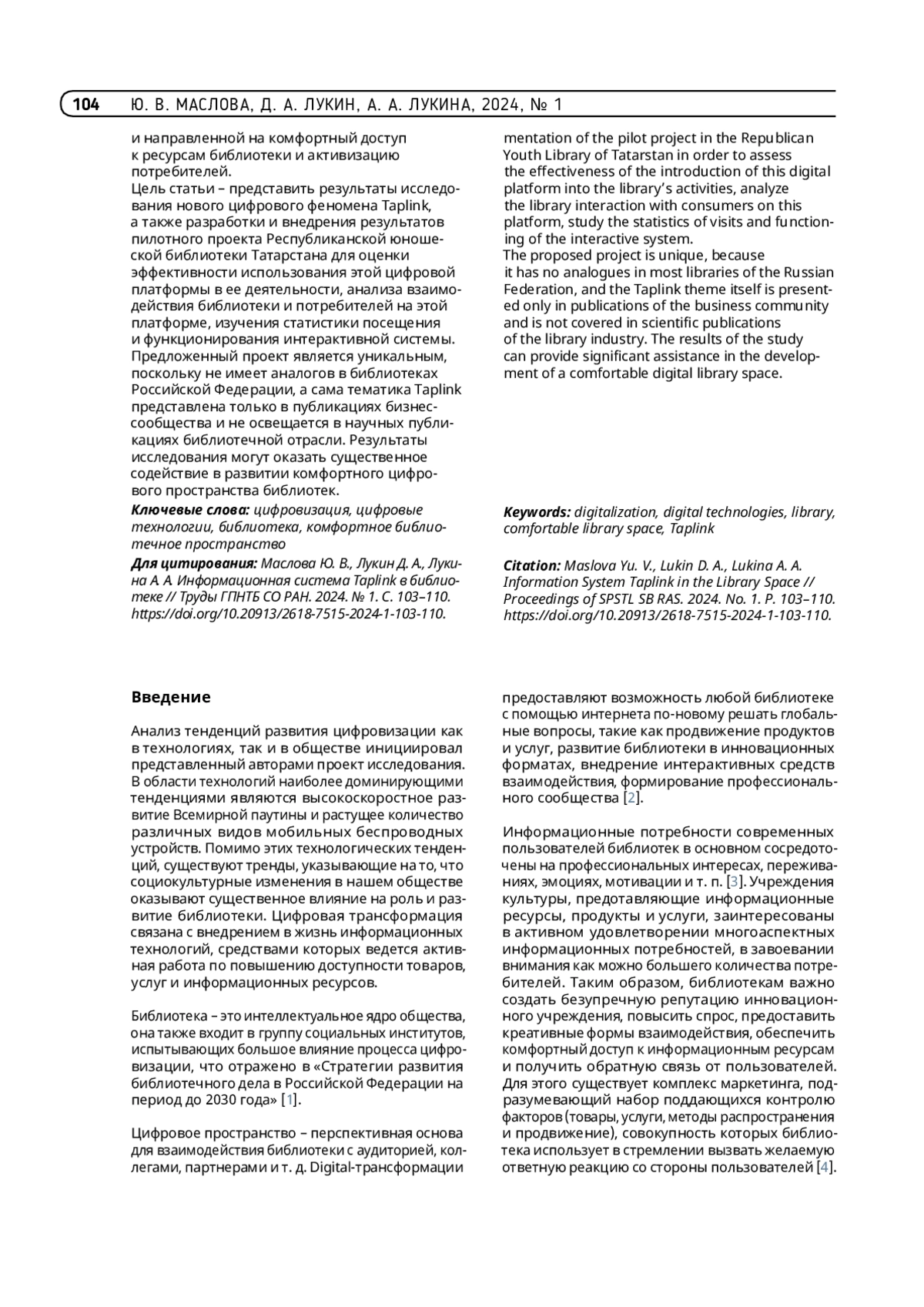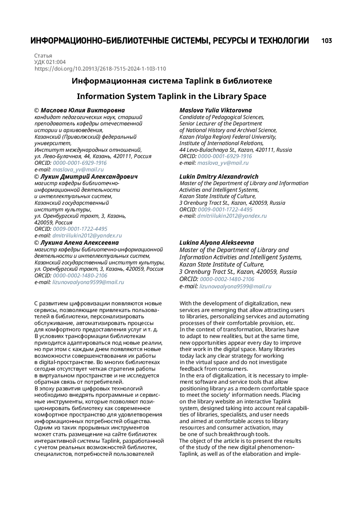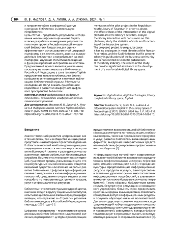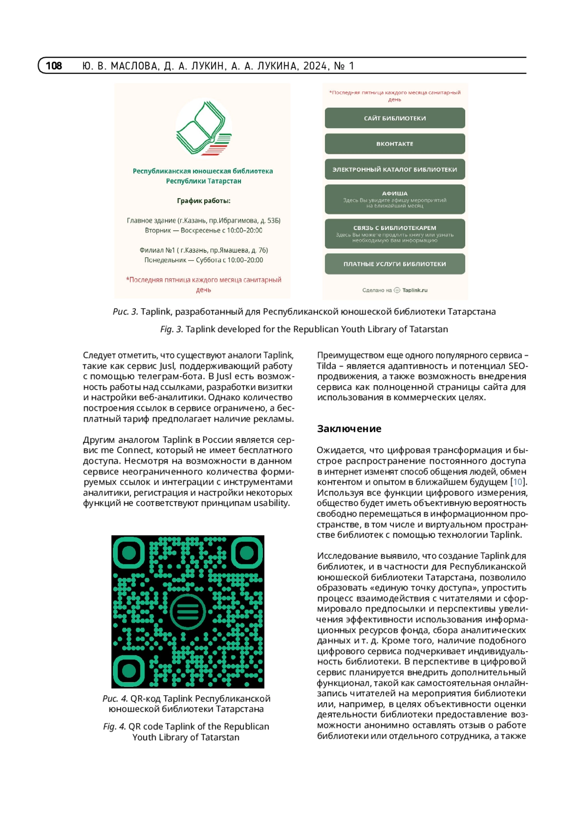 Цель статьи – представить результаты исследования нового цифрового феномена Taplink, а также разработки и внедрения результатов пилотного проекта Республиканской юношеской библиотеки Татарстана для оценки эффективности использования этой цифровой платформы в ее деятельности, анализа взаимодействия библиотеки и потребителей на этой платформе, изучения статистики посещения и функционирования интерактивной системы. Предложенный проект является уникальным, поскольку не имеет аналогов в библиотеках Российской Федерации, а сама тематика Taplink представлена только в публикациях бизнес-сообщества и не освещается в научных публикациях библиотечной отрасли. Результаты исследования могут оказать существенное содействие в развитии комфортного цифрового пространства библиотек.