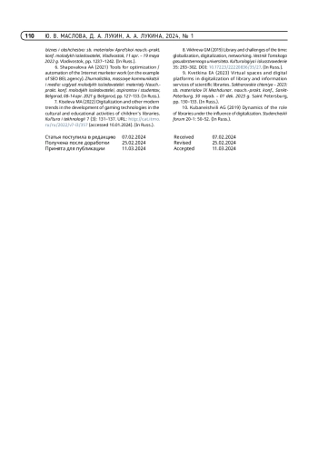 10. Кубанеишвили А. Г. Динамика роли библиотек под влиянием цифровизации // Студенческий форум. 2019. № 20-1. С. 50-52.