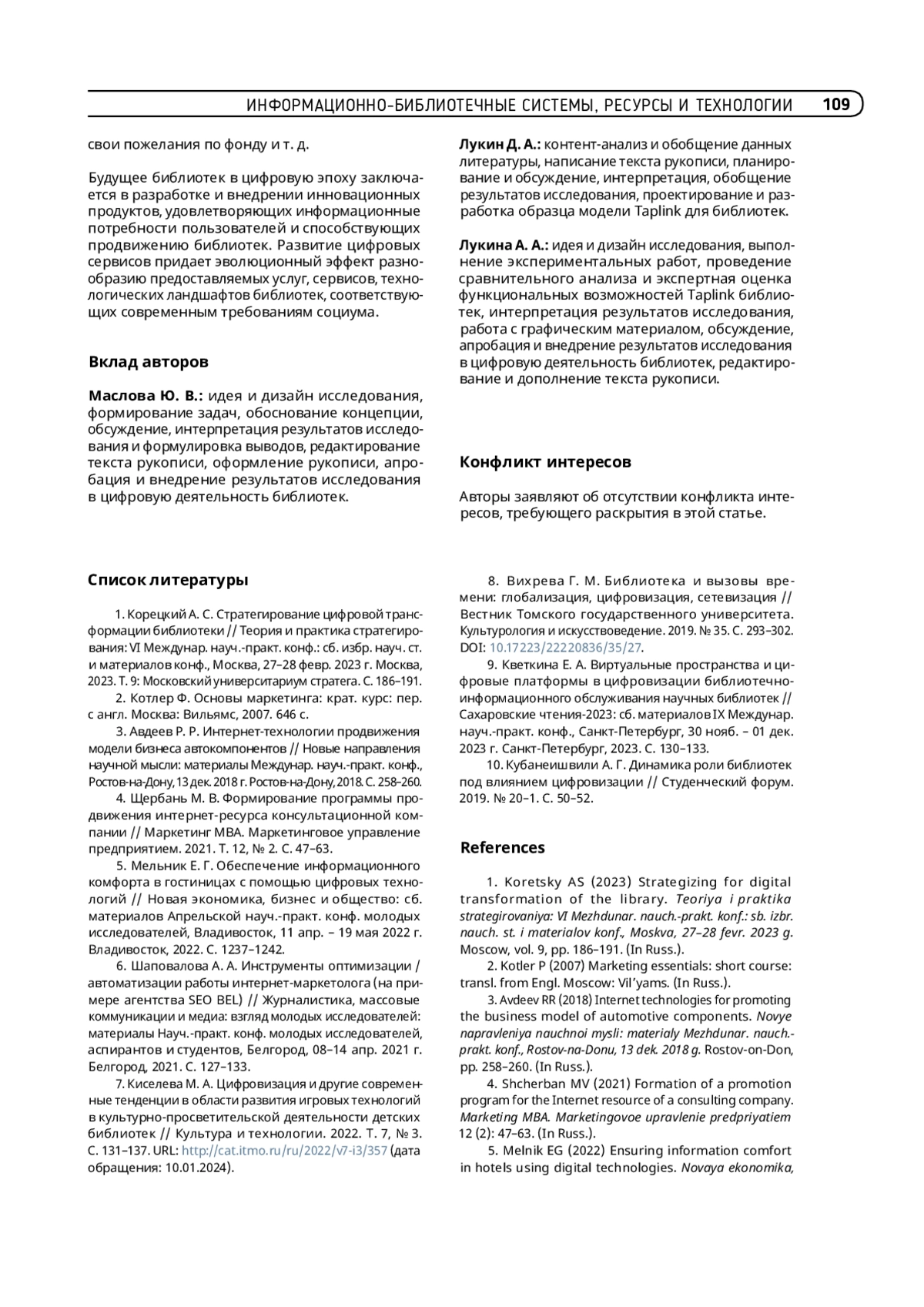 С развитием цифровизации появляются новые сервисы, позволяющие привлекать пользователей в библиотеки, персонализировать обслуживание, автоматизировать процессы для комфортного предоставления услуг и т. д. В условиях трансформации библиотекам приходится адаптироваться под новые реалии, но при этом с каждым днем появляются новые возможности совершенствования их работы в digital-пространстве. Во многих библиотеках сегодня отсутствует четкая стратегия работы в виртуальном пространстве и не исследуется обратная связь от потребителей. В эпоху развития цифровых технологий необходимо внедрять программные и сервисные инструменты, которые позволяют позиционировать библиотеку как современное комфортное пространство для удовлетворения информационных потребностей общества. Одним из таких прорывных инструментов может стать размещение на сайте библиотек интерактивной системы Taplink, разработанной с учетом реальных возможностей библиотек, специалистов, потребностей пользователей и направленной на комфортный доступ к ресурсам библиотеки и активизацию потребителей.