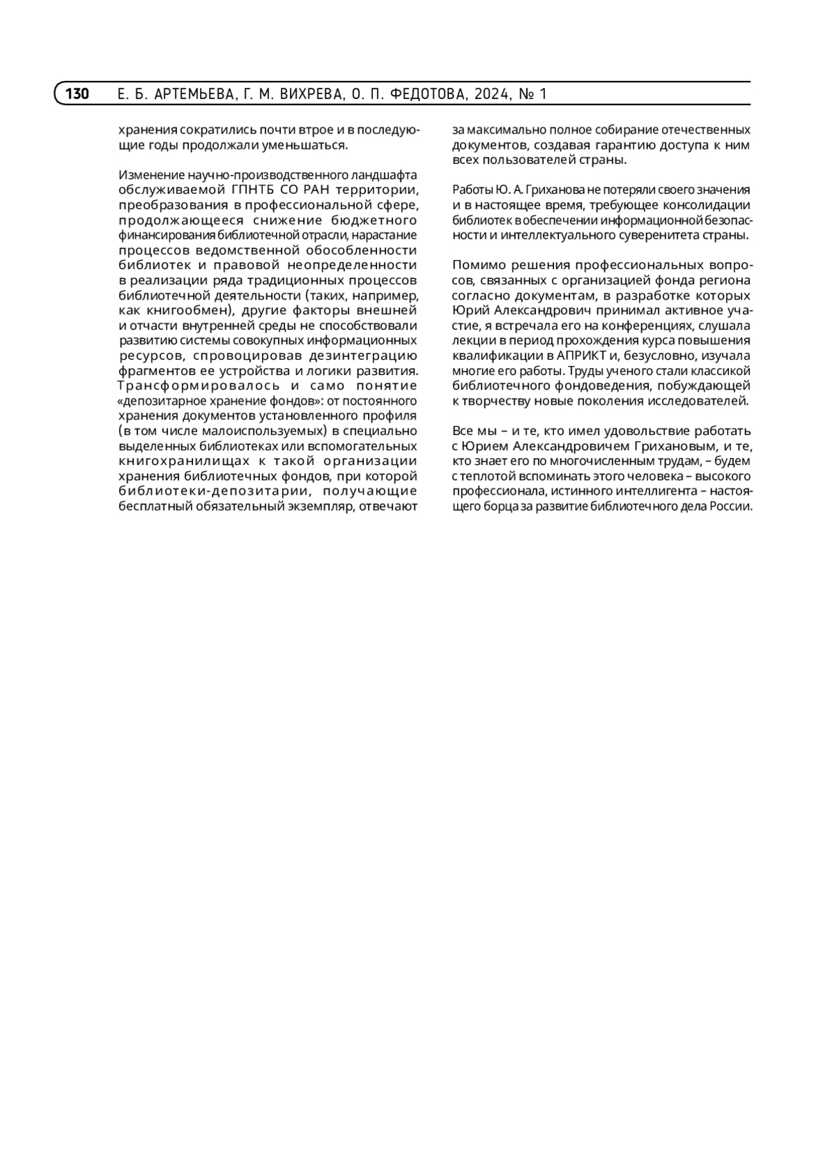 Работы Ю. А. Гриханова не потеряли своего значения и в настоящее время, требующее консолидации библиотек в обеспечении информационной безопасности и интеллектуального суверенитета страны.