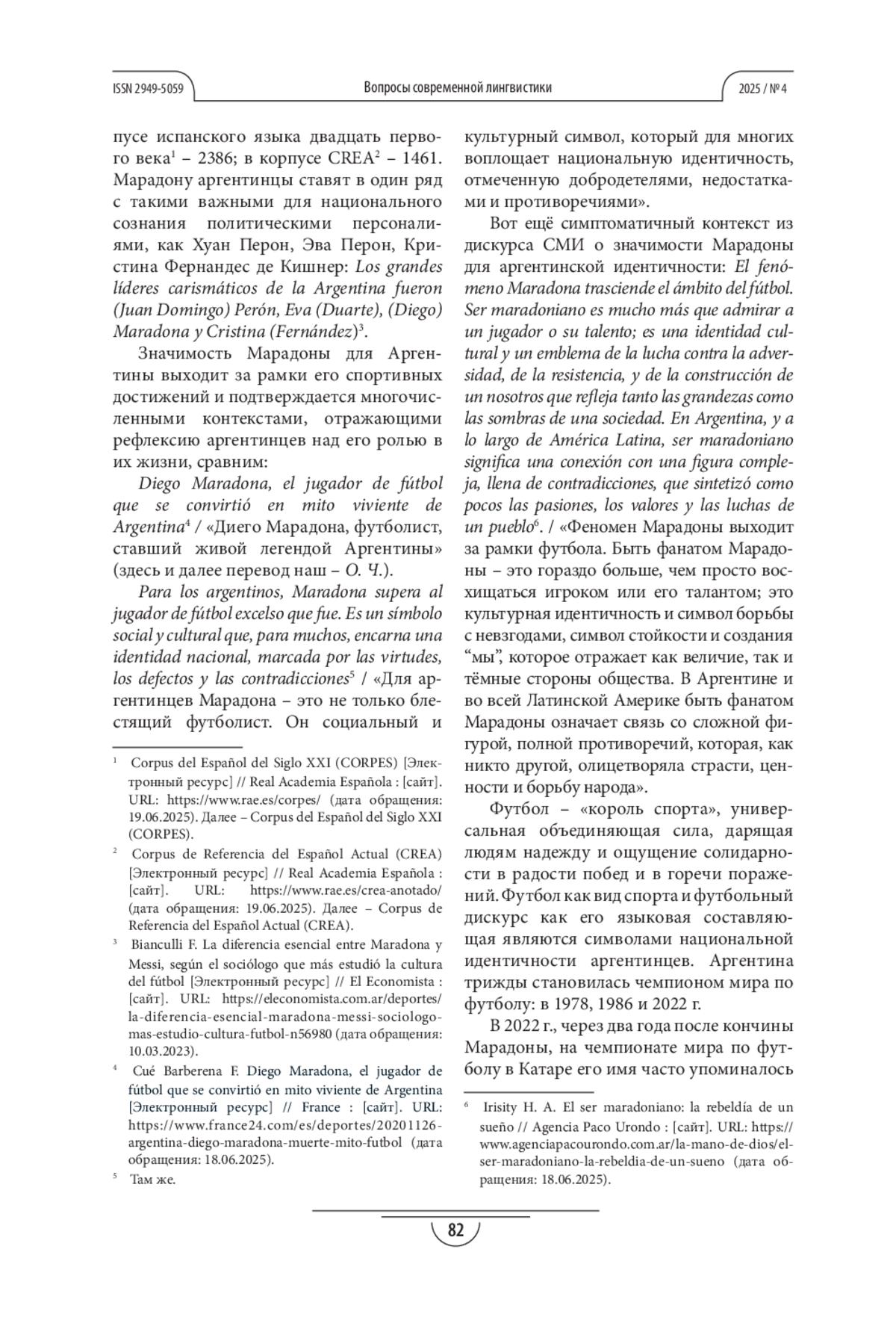 10. Чеснокова О. С. Песенный дискурс аргентинских футбольных болельщиков сквозь призму национальной идентичности // Вопросы современной лингвистики. 2023. № 4. С. 154-165. DOI: 10.18384/2949-5075-2023-4-154-165 EDN: QYAJRV