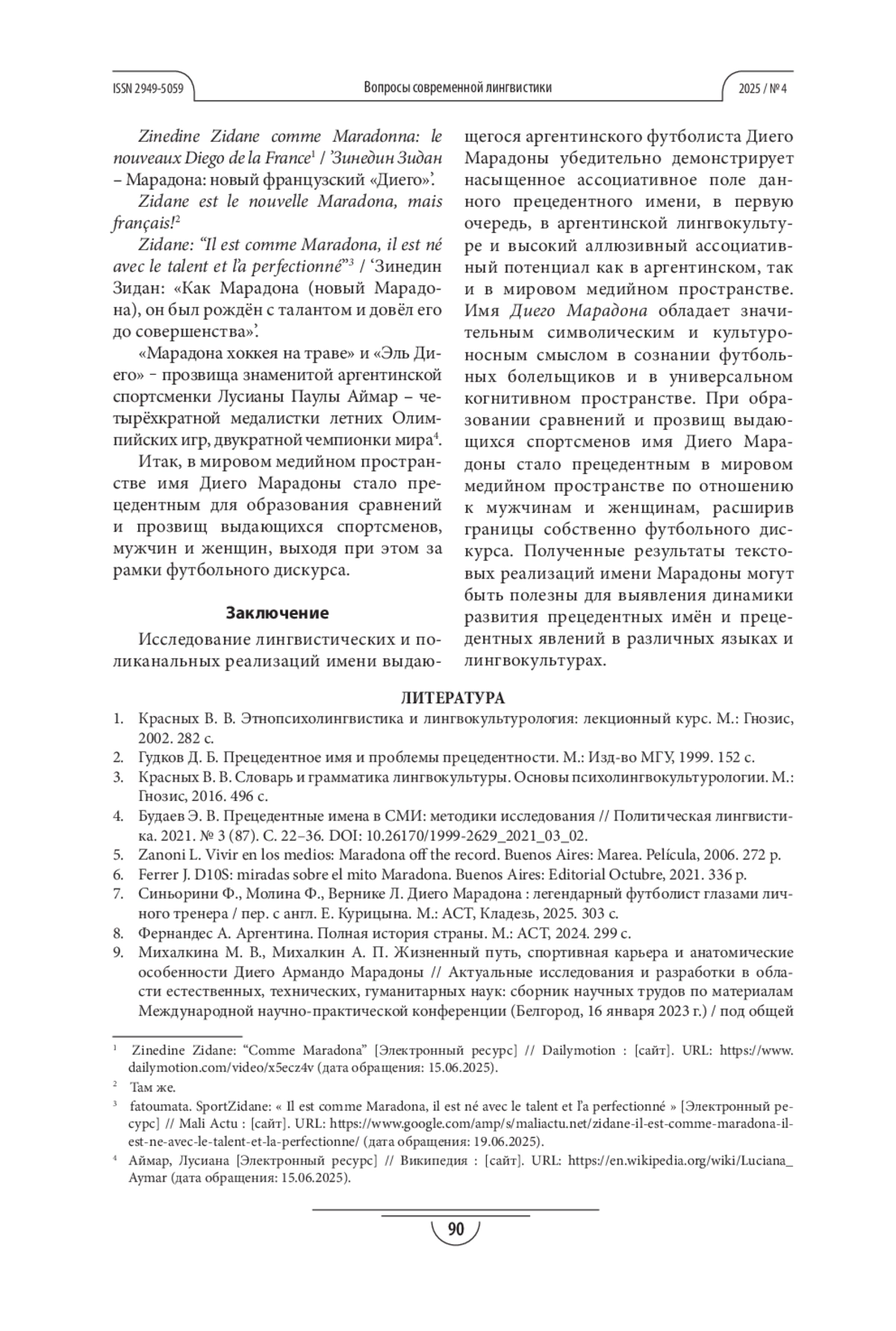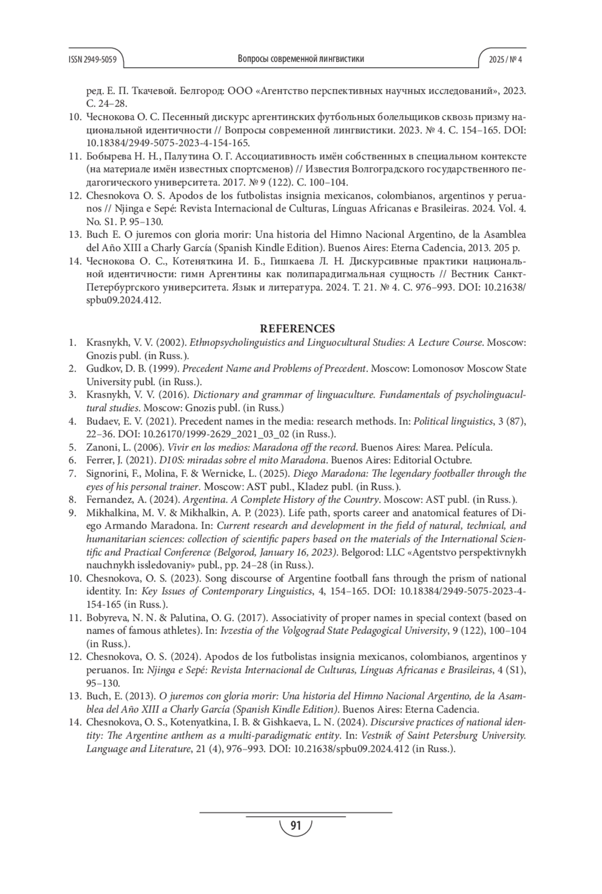 12. Chesnokova O. S. Apodos de los futbolistas insignia mexicanos, colombianos, argentinos y peruanos // Njinga e Sepé: Revista Internacional de Culturas, Línguas Africanas e Brasileiras. 2024. Vol. 4. No. S1. P. 95-130. EDN: NRRBEA