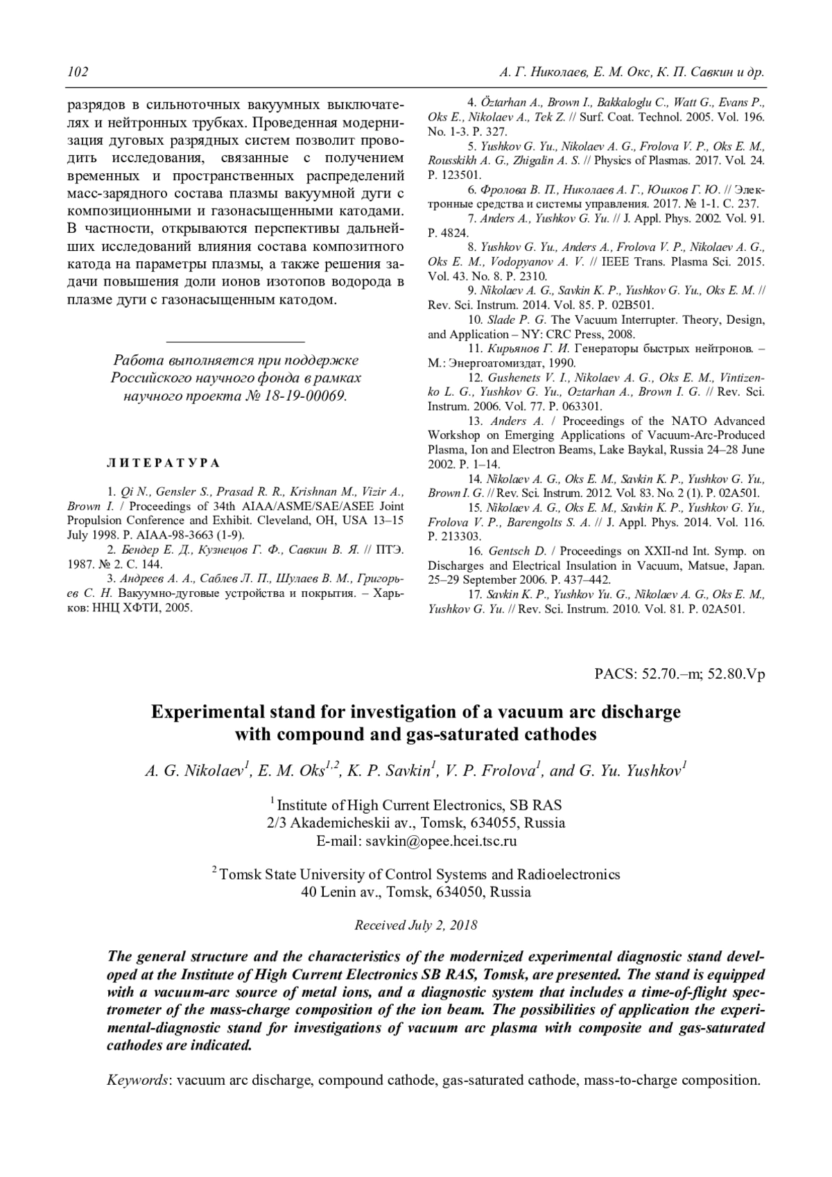 14. Nikolaev A. G., Oks E. M., Savkin K. P., Yushkov G. Yu., Brown I. G. // Rev. Sci. Instrum. 2012. Vol. 83. No. 2 (1). P. 02A501.