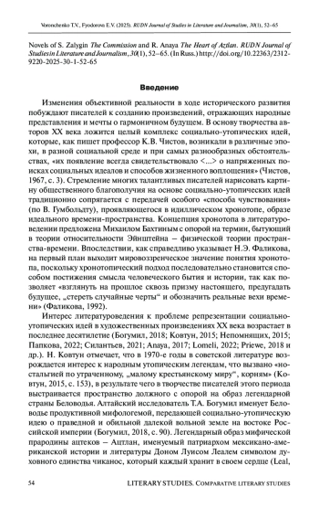 Сопоставление романов русского советского писателя Сергея Залыгина «Комиссия» (1976) и американского автора мексиканского происхождения (чикано) Рудольфо Анайя «Сердце Ацтлана» (1976), опубликованных в одно время на разных континентах, обусловлено стремлением известных прозаиков XX века определить возможные пути достижения общественной гармонии в меняющейся исторической реальности. В статье рассматривается полифункциональность идиллического хронотопа при использовании писателями 70-х годов XX века социально-утопических идей. Новизна исследования определена усилением акцента на безусловной роли идиллического хронотопа в раскрытии идейно-тематического содержания, оценке масштаба личности автора и важности его вклада в мировую литературу. Выделены мировоззренческая, жанро- и сюжетообразующая функции идиллического хронотопа, определена его миромоделирующая роль в художественных произведениях. Установлено, что в романе С. Залыгина идея о гармонизации общественного порядка приобретает форму «воспоминаний о будущем», поскольку образ Белого Бора, восходящий к Беловодью, символизирует «потерянный рай» патриархальной идиллии русской деревни. Р. Анайя воссоздает образ духовной прародины ацтеков - Ацтлана, который становится ориентиром в определении национальной идентичности американцев мексиканского происхождения в процессе их самоутверждения и возлагает надежду на благополучное построение светлого будущего.