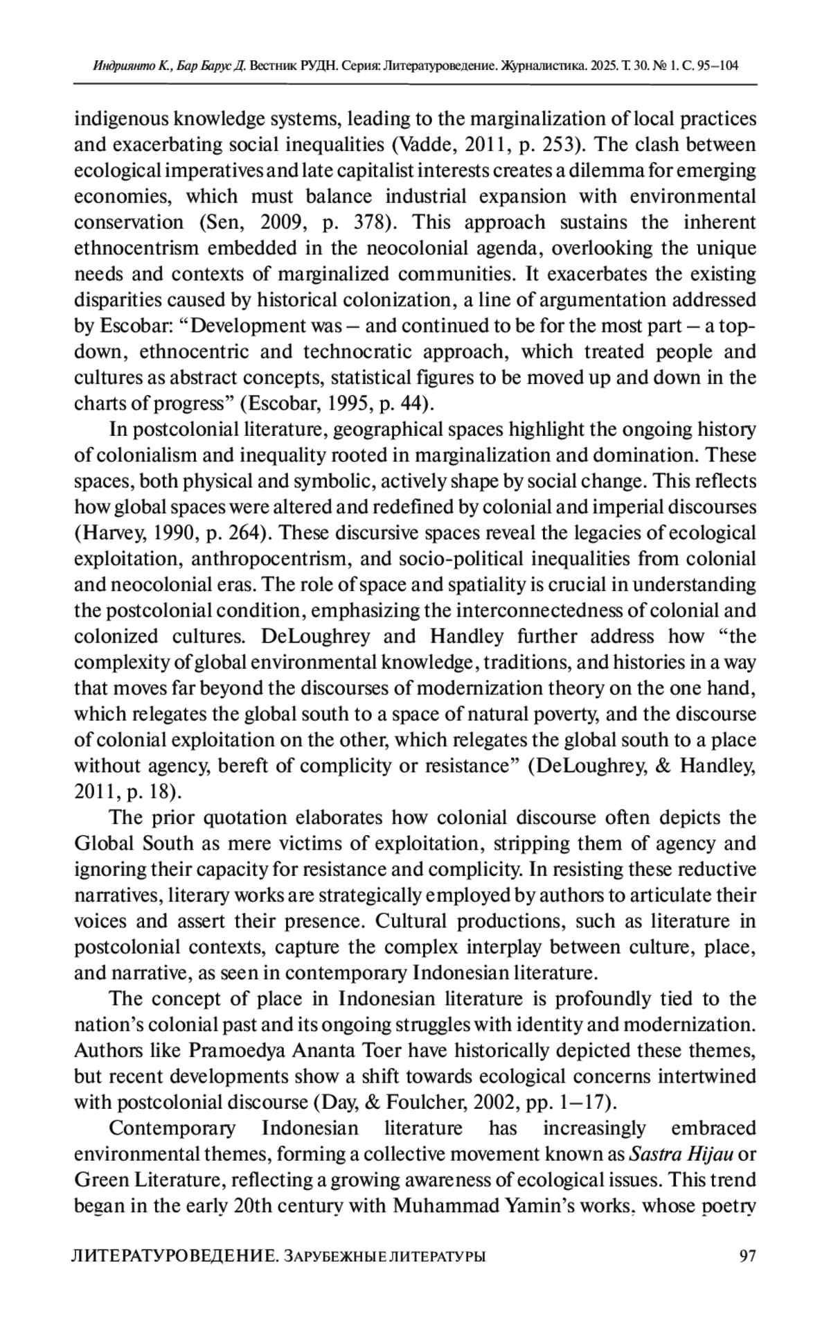 Цель – раскрыть влияние антропоцентризма на постколониальную Индонезию на материале романа Ратны Индрасвари Ибрахим «Лема Танджун». В повествовании ярко изображены последствия модернизации, результатом которой стали вырубки лесов и потери зеленых зон, что вызывает чувство утраты эмоциональной привязанности к родным местам, показана борьба за сохранение зеленых насаждений в урбанистических капиталистических условиях. Используя постколониальные экокритические подходы, подвергаются анализу западные парадигмы развития, где приоритет отводится экономическому росту, а экологическая безопасность и социальная справедливость отодвигаются на задний план.