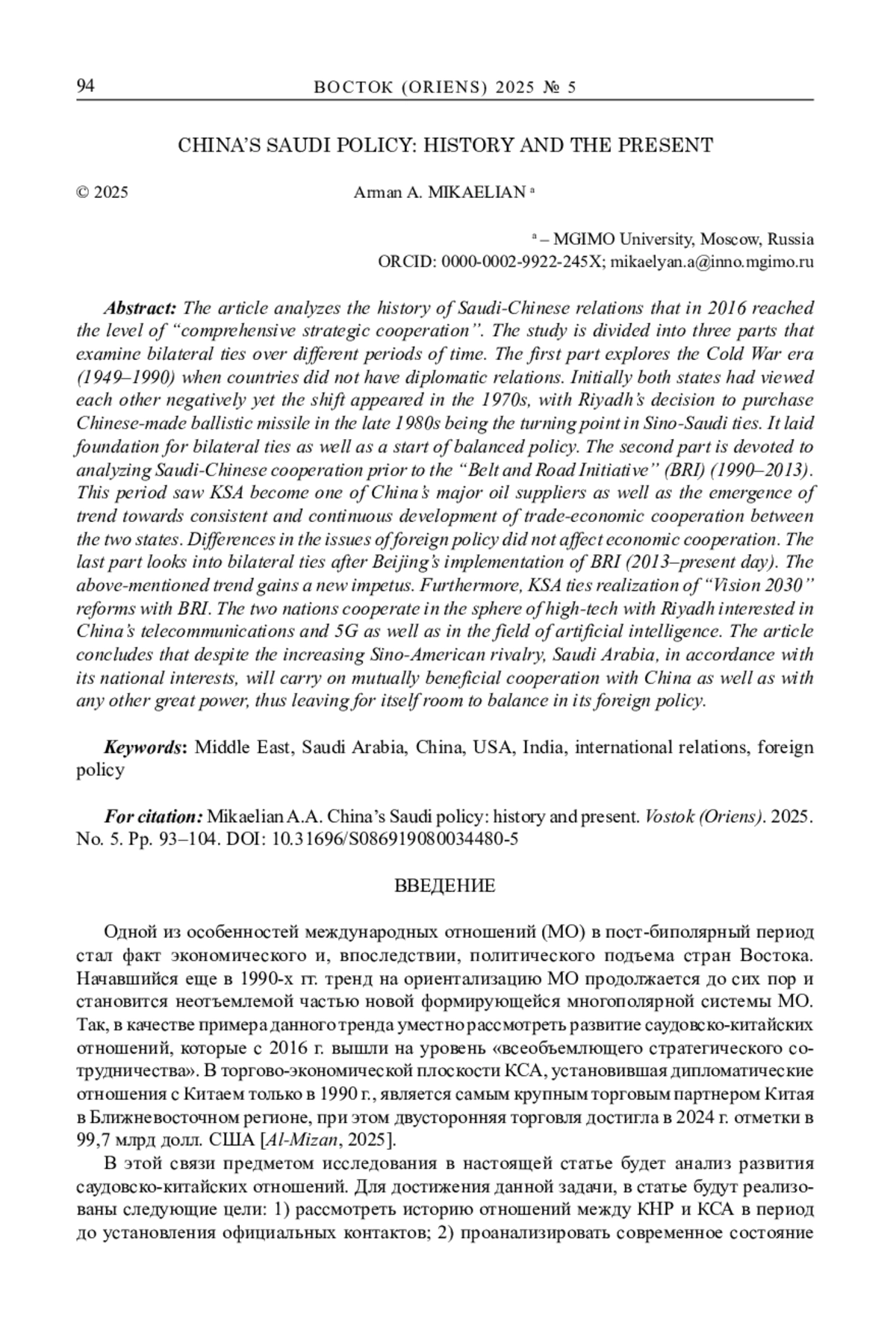 Н астоящая статья посвящена анализу развития саудовско-китайских отношений, вышедших с 2016 г. на уровень «всеобъемлющего стратегического сотрудничества». Исследование разделено на три блока, рассматривающих сотрудничество двух стран в разные хронологические периоды. В первой части анализируются саудовско-китайские отношения в период Холодной войны (1949–1990), когда между странами отсутствовали дипломатические отношения. Первоначальная обоюдосторонняя негативная оценка стран стала изменяться с 1970-х гг. после сближения Вашингтона и Пекина, при этом поворотным моментом стала покупка Саудовской Аравией в конце 1980-х гг. баллистических ракет средней дальности китайского производства. Данный шаг заложил основу как саудовской политики маневрирования, так и саудовско-китайским отношениям. Вторая часть рассматривает двусторонние контакты в период (1990–2013) до начала реализации инициативы «Один пояс, один путь» (ОПОП). В данный период КСА становится одним из крупнейших поставщиков нефти для нужд КНР. Появляется тренд на стабильное и последовательное развитие торгово-экономического сотрудничества, при этом разногласия по внешнеполитическим вопросам не оказывают влияния на саудовскокитайские отношения. Третья часть посвящена анализу двусторонних отношений после начала реализации ОПОП (2013– н. в.). Указанный выше тренд развития получил новый импульс, более того, Эр-Рияд связывает выполнение своей программы реформ «Видение 2030» с ОПОП. Интенсифицируется сотрудничество в сфере высоких технологий, при этом КСА особо заинтересовано в получении китайских телекоммуникационных технологий (5G) и разработок в области искусственного интеллекта. В статье сделан вывод, что, несмотря на рост противоречий между КНР и США, КСА, руководствуясь своими национальными интересами, продолжит взаимовыгодное сотрудничество с КНР, равно как и с любыми другими великими державами, оставляя себе тем самым пространство для маневрирования и балансирования во внешнеполитических и экономических вопросах, продолжая тем самым политический курс, заложенный ещё в конце 1980-х гг.