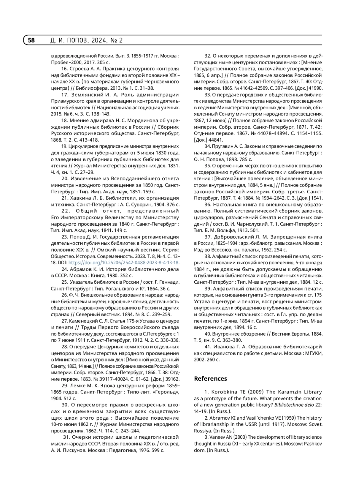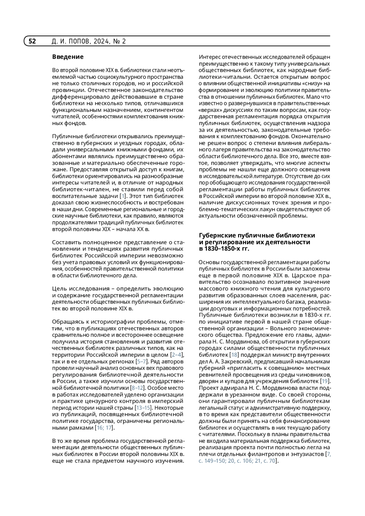 ПОПОВ Д. И. ГОСУДАРСТВЕННАЯ РЕГЛАМЕНТАЦИЯ ДЕЯТЕЛЬНОСТИ ПУБЛИЧНЫХ БИБЛИОТЕК В РОССИИ ВО ВТОРОЙ ПОЛОВИНЕ XIX В. // ТРУДЫ ГПНТБ СО РАН. 2024. № 2