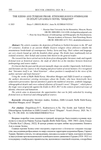 Статья посвящена репрезентации езидизма в турецкой художественной литературе XX–XXI вв. Езидизм – древнейшая ближневосточная религия, последователи которой заселяли горные пограничья современных Турции, Сирии и Ирака, а их культура и язык самым тесным образом связаны с курдским этносом. В настоящее время численность езидов в мире составляет порядка одного миллиона человек.