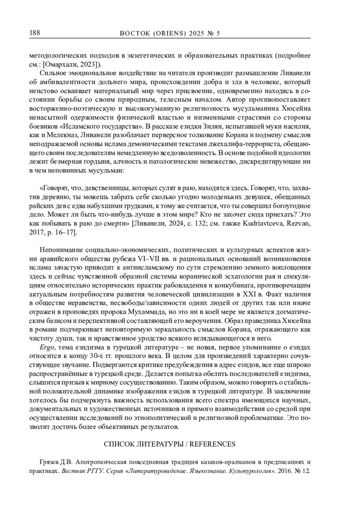 1. Грязев Д.В. Апотропеическая повседневная традиция казахов-оралманов в предписаниях и практиках. Вестник РГГУ. Серия “Литературоведение. Языкознание. Культурология”. 2016. № 12. С. 72-88. EDN: YNCVXV