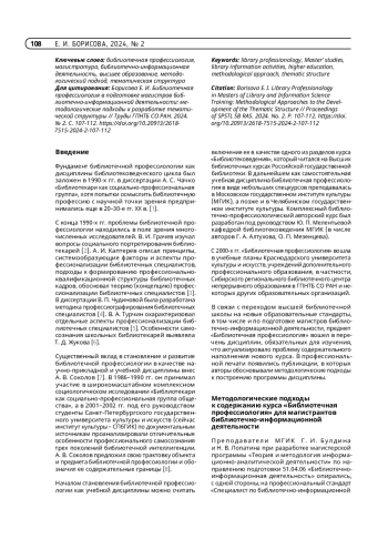Статья: Библиотечная профессиология в подготовке магистров библиотечно-информационной деятельности: методологические подходы к разработке тематической структуры (2024)