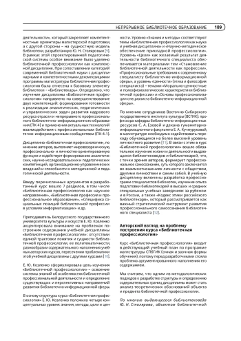 Предложен один из вариантов структурно-логической модели курса «Библиотечная профессиология» – комплексной теоретико-прикладной дисциплины, охватывающей широкий круг проблем, связанных с местом и ролью библиотечной профессии в обществе. Освоение магистрантами сущности и содержания библиотечной профессиологии обусловливает необходимость приобретения различных профессиональных компетенций, среди которых наиболее значимыми являются общепедагогические. По этой причине центральное место в курсе должно занять изучение вопросов, связанных с профессиональным образованием: от истории до актуальных проблем организации подготовки библиотечных специалистов, содержания, методов и форм обучения на современном этапе.