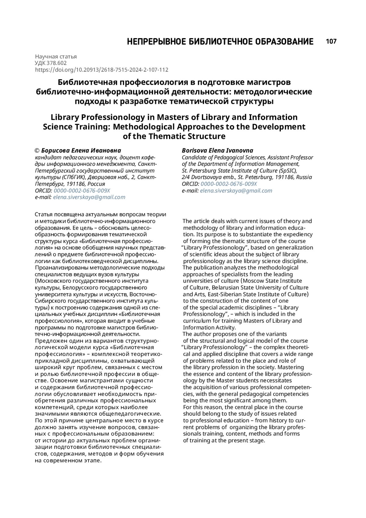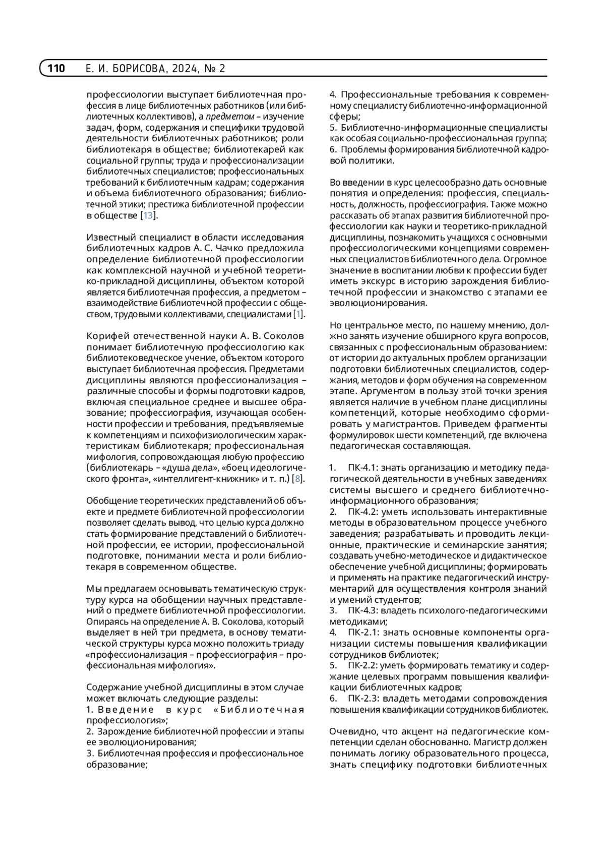 БОРИСОВА Е. И. БИБЛИОТЕЧНАЯ ПРОФЕССИОЛОГИЯ В ПОДГОТОВКЕ МАГИСТРОВ БИБЛИОТЕЧНО-ИНФОРМАЦИОННОЙ ДЕЯТЕЛЬНОСТИ: МЕТОДОЛОГИЧЕСКИЕ ПОДХОДЫ К РАЗРАБОТКЕ ТЕМАТИЧЕСКОЙ СТРУКТУРЫ // ТРУДЫ ГПНТБ СО РАН. 2024. № 2