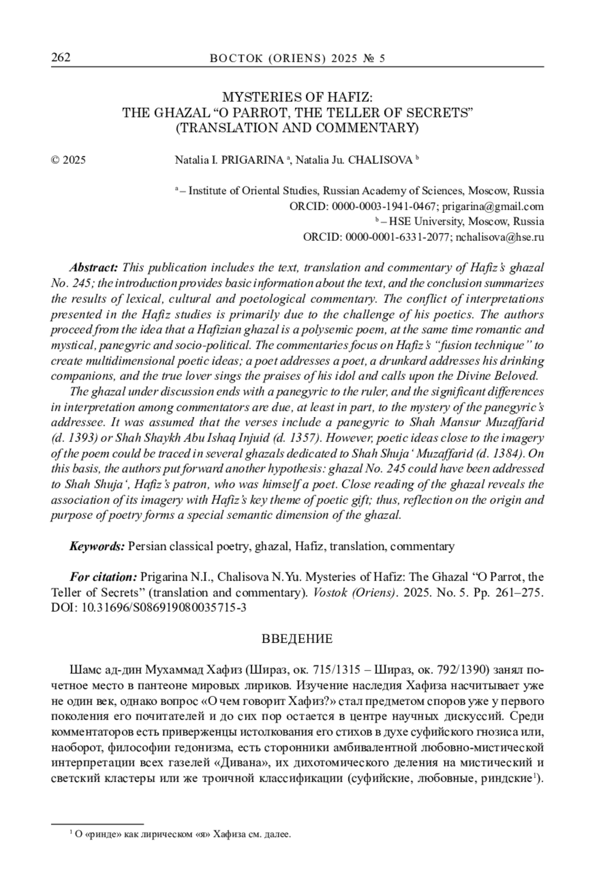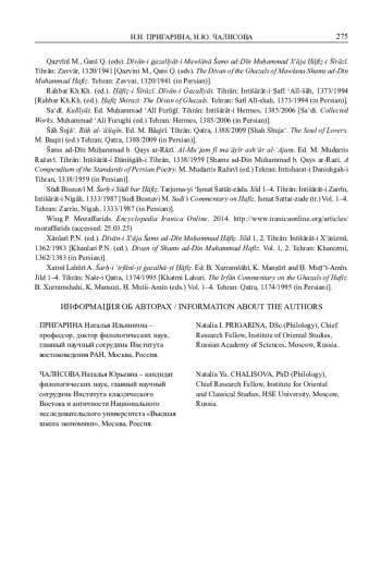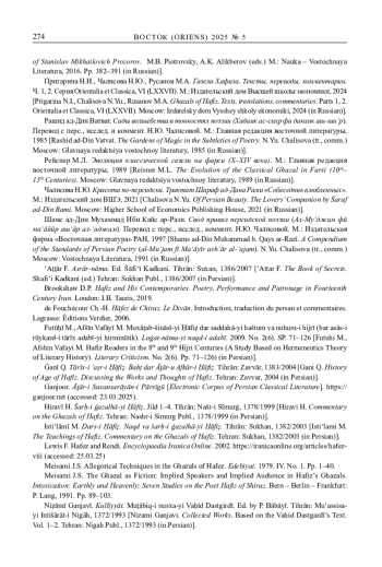 3. Пригарина Н.И., Чалисова Н.Ю., Русанов М.А. Газели Хафиза. Тексты, переводы, комментарии. Ч. 1, 2. Серия Orientalia et Classica, VI (LXXVII). М.: Издательский дом Высшей школы экономики, 2024. EDN: DBPMFV