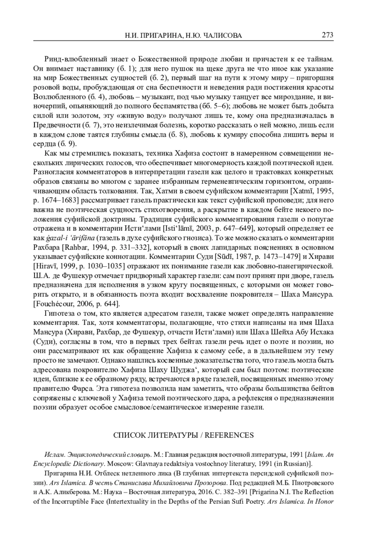 2. Пригарина Н.И. Отблеск нетленного лика (В глубинах интертекста персидской суфийской поэзии). Ars Islamica. В честь Станислава Михайловича Прозорова. Под редакцией М.Б. Пиотровского и А.К. Аликберова. М.: Наука - Восточная литература, 2016. С. 382-391.