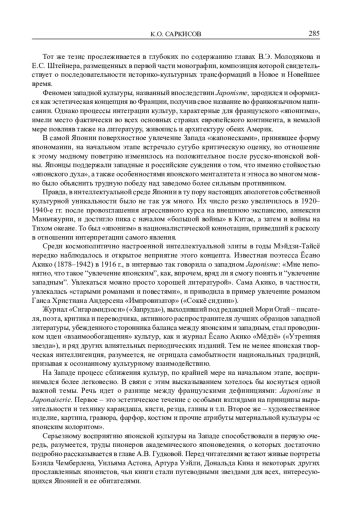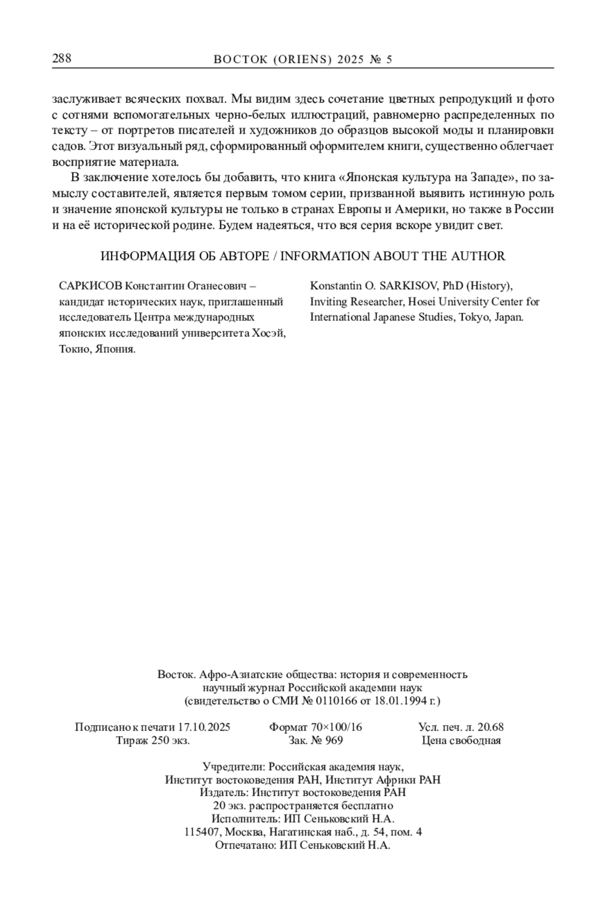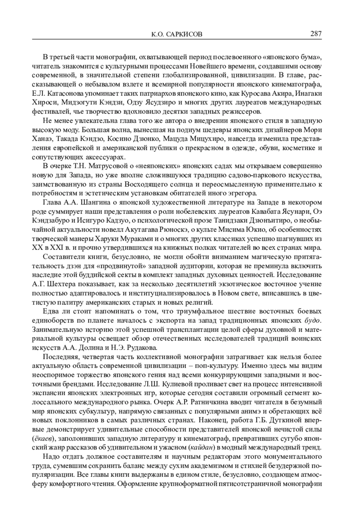 САРКИСОВ К. О. [РЕЦ. НА:] ЯПОНСКАЯ КУЛЬТУРА НА ЗАПАДЕ. КОЛЛЕКТИВНАЯ МОНОГРАФИЯ. ОТВ. РЕД. Е. Л. КАТАСОНОВА, А. А. ДОЛИН. М.: ИВ РАН, 2024. 544 С. ISBN: 978-5-907846-81-4 // ВОСТОК. АФРО-АЗИАТСКИЕ ОБЩЕСТВА: ИСТОРИЯ И СОВРЕМЕННОСТЬ. 2025. № 5