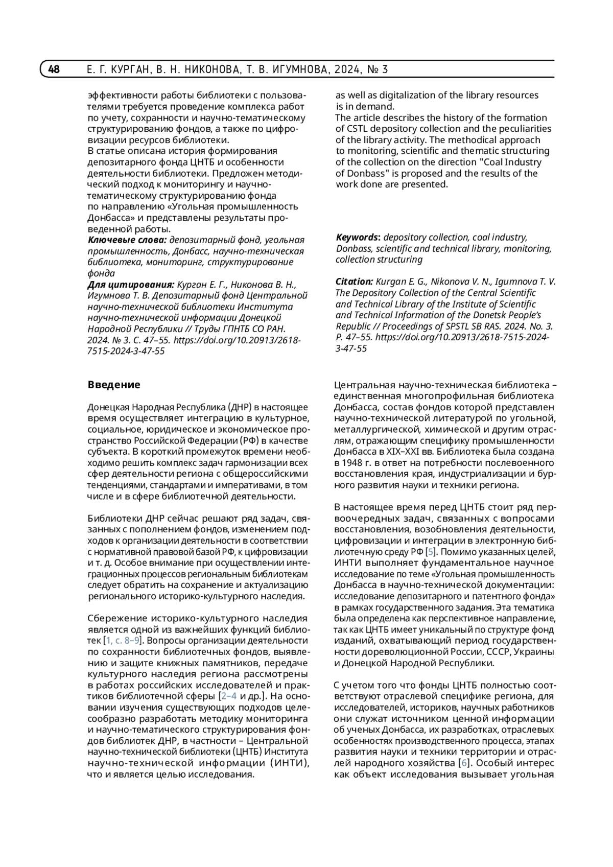 Цель статьи – представить историю деятельности и условия формирования депозитарного фонда Центральной научно-технической библиотеки (ЦНТБ) Института научно-технической информации (ИНТИ) Донецкой Народной Республики, обосновать необходимость исследования фонда по тематическому направлению «Угольная промышленность Донбасса» и разработать методический подход к его мониторингу и научно-тематическому структурированию.