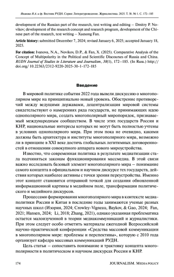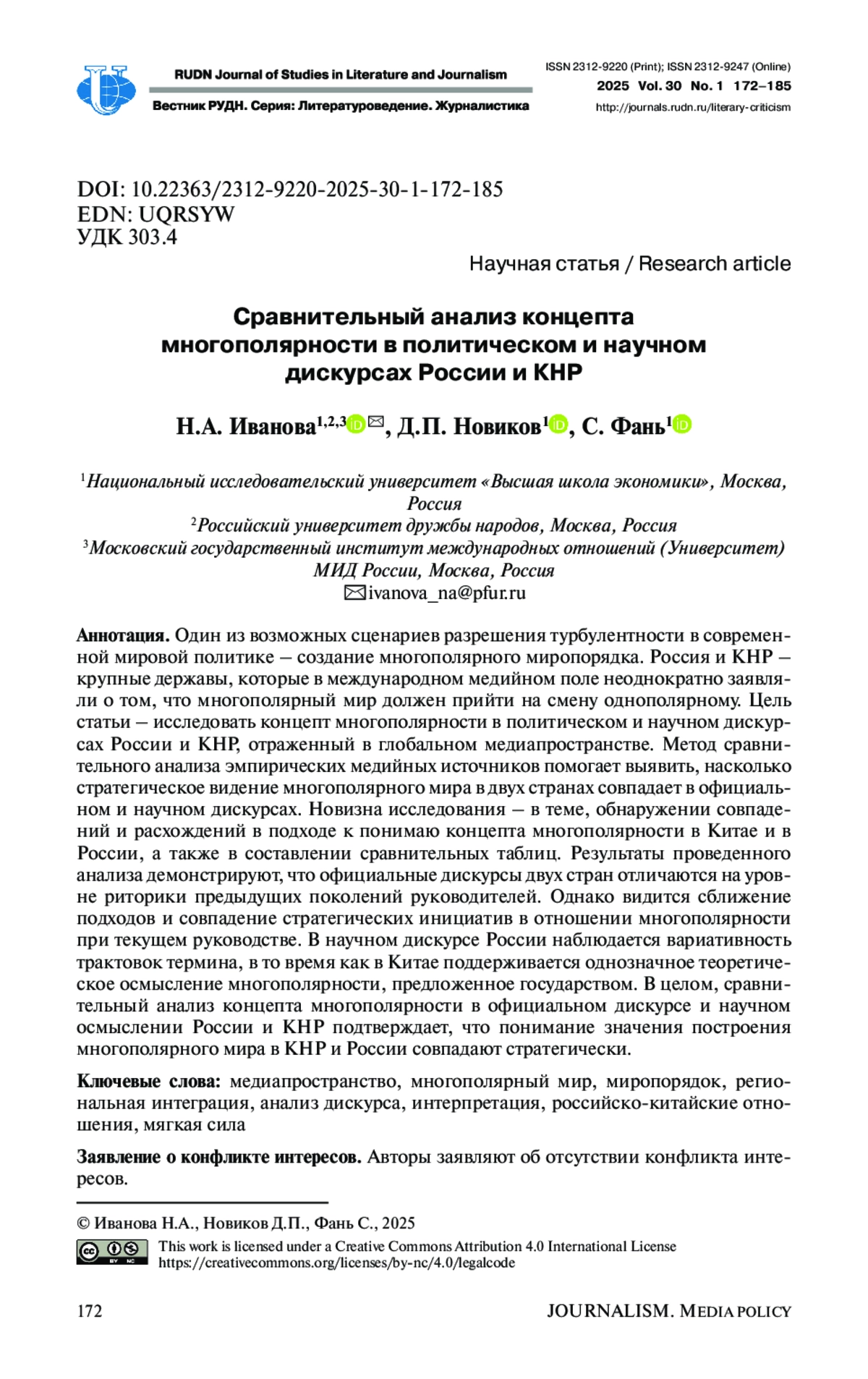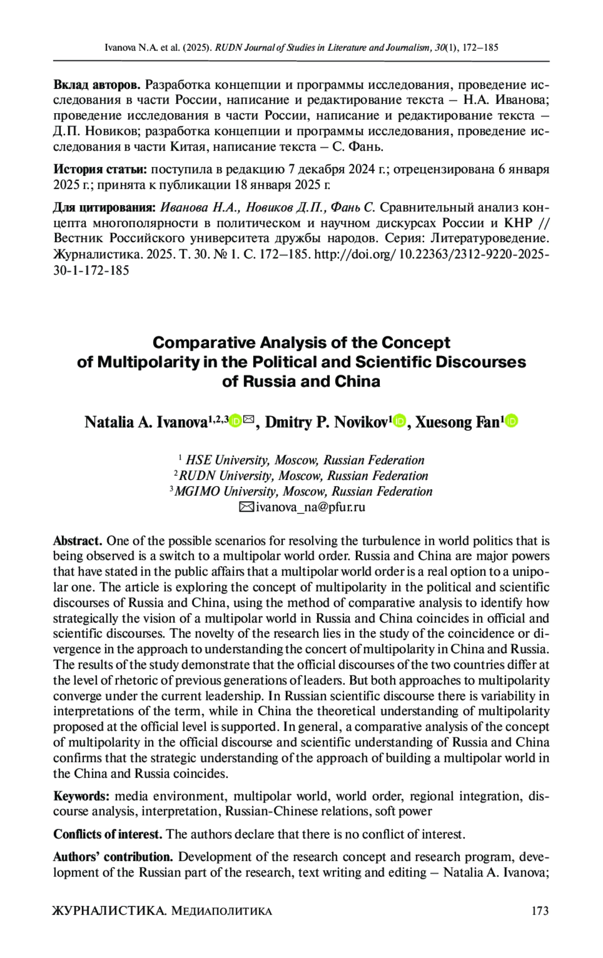 Цель статьи - исследовать концепт многополярности в политическом и научном дискурсах России и КНР, отраженный в глобальном медиапространстве. Метод сравнительного анализа эмпирических медийных источников помогает выявить, насколько стратегическое видение многополярного мира в двух странах совпадает в официальном и научном дискурсах. Новизна исследования - в теме, обнаружении совпадений и расхождений в подходе к понимаю концепта многополярности в Китае и в России, а также в составлении сравнительных таблиц. Результаты проведенного анализа демонстрируют, что официальные дискурсы двух стран отличаются на уровне риторики предыдущих поколений руководителей. Однако видится сближение подходов и совпадение стратегических инициатив в отношении многополярности при текущем руководстве. В научном дискурсе России наблюдается вариативность трактовок термина, в то время как в Китае поддерживается однозначное теоретическое осмысление многополярности, предложенное государством. В целом, сравнительный анализ концепта многополярности в официальном дискурсе и научном осмыслении России и КНР подтверждает, что понимание значения построения многополярного мира в КНР и России совпадают стратегически.